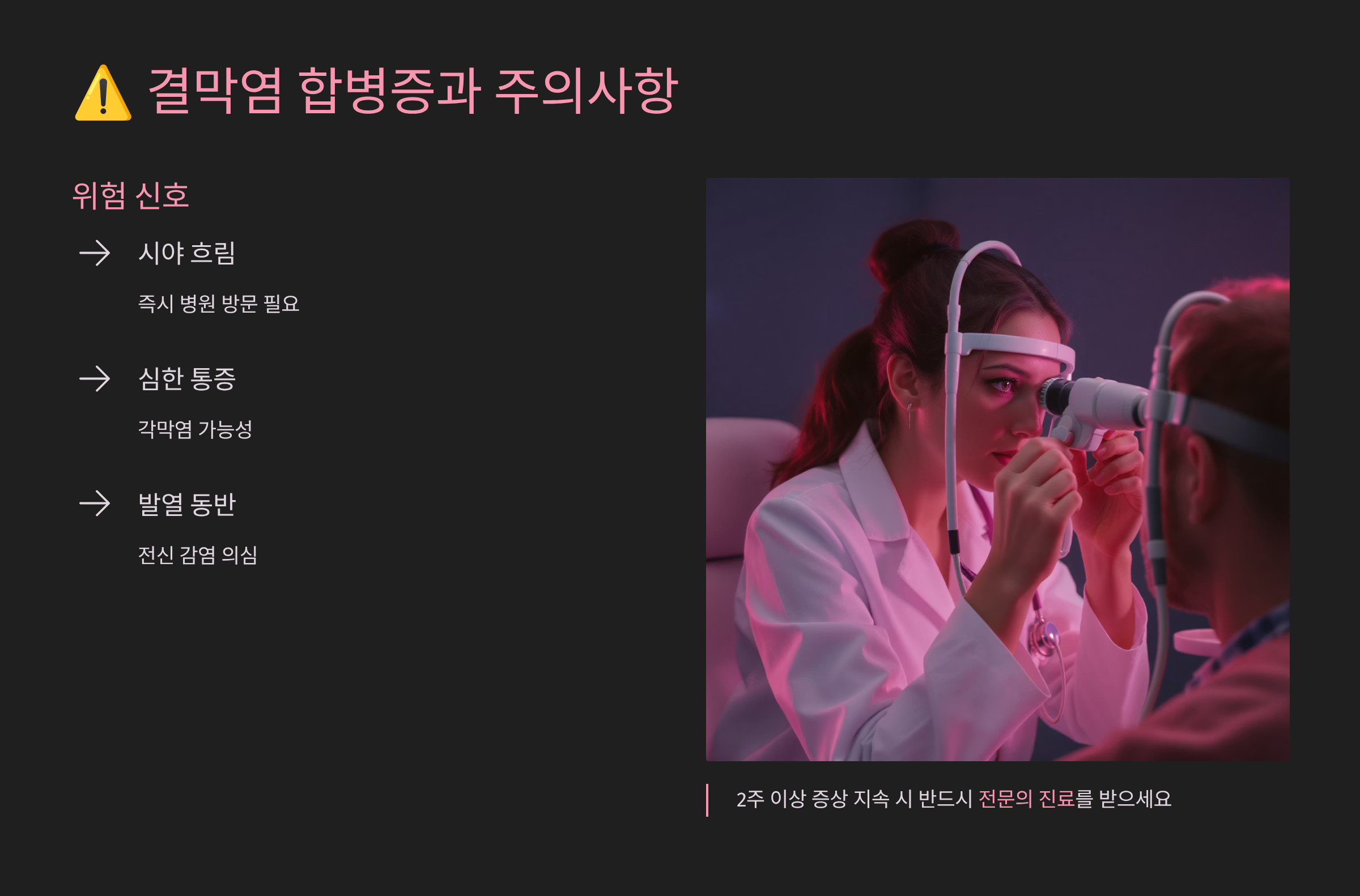 결막염을 제때 치료하지 않으면 심각한 합병증이 생길 수 있어요. 가장 흔한 합병증은 각막염이에요. 결막의 염증이 각막으로 확산되면 시력 저하나 실명까지 이어질 수 있답니다. 특히 아데노바이러스에 의한 유행성 각결막염은 각막 상피하 침윤을 일으켜 수개월간 시력 장애를 유발할 수 있어요. 각막에 흉터가 남으면 영구적인 시력 손상이 될 수 있으니 주의가 필요해요.