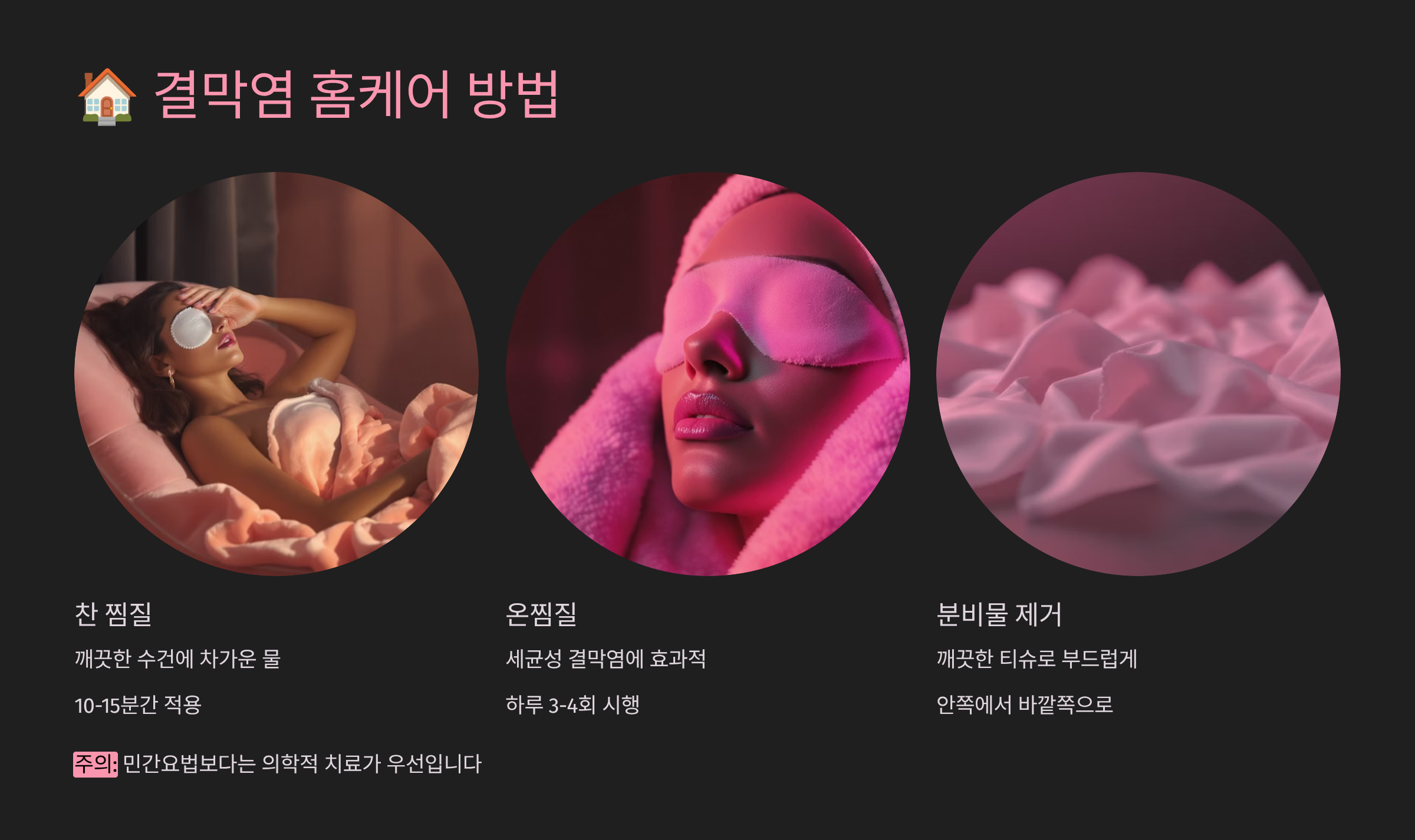 결막염 홈케어의 기본은 냉찜질이에요. 깨끗한 수건을 차가운 물에 적셔서 눈 위에 10-15분간 올려두면 충혈과 부종이 완화된답니다. 하루에 3-4회 정도 시행하면 좋아요. 얼음을 직접 대는 것은 피하고, 수건으로 감싸서 사용해야 해요. 알레르기성 결막염에는 특히 효과적이며, 가려움증도 줄여준답니다.