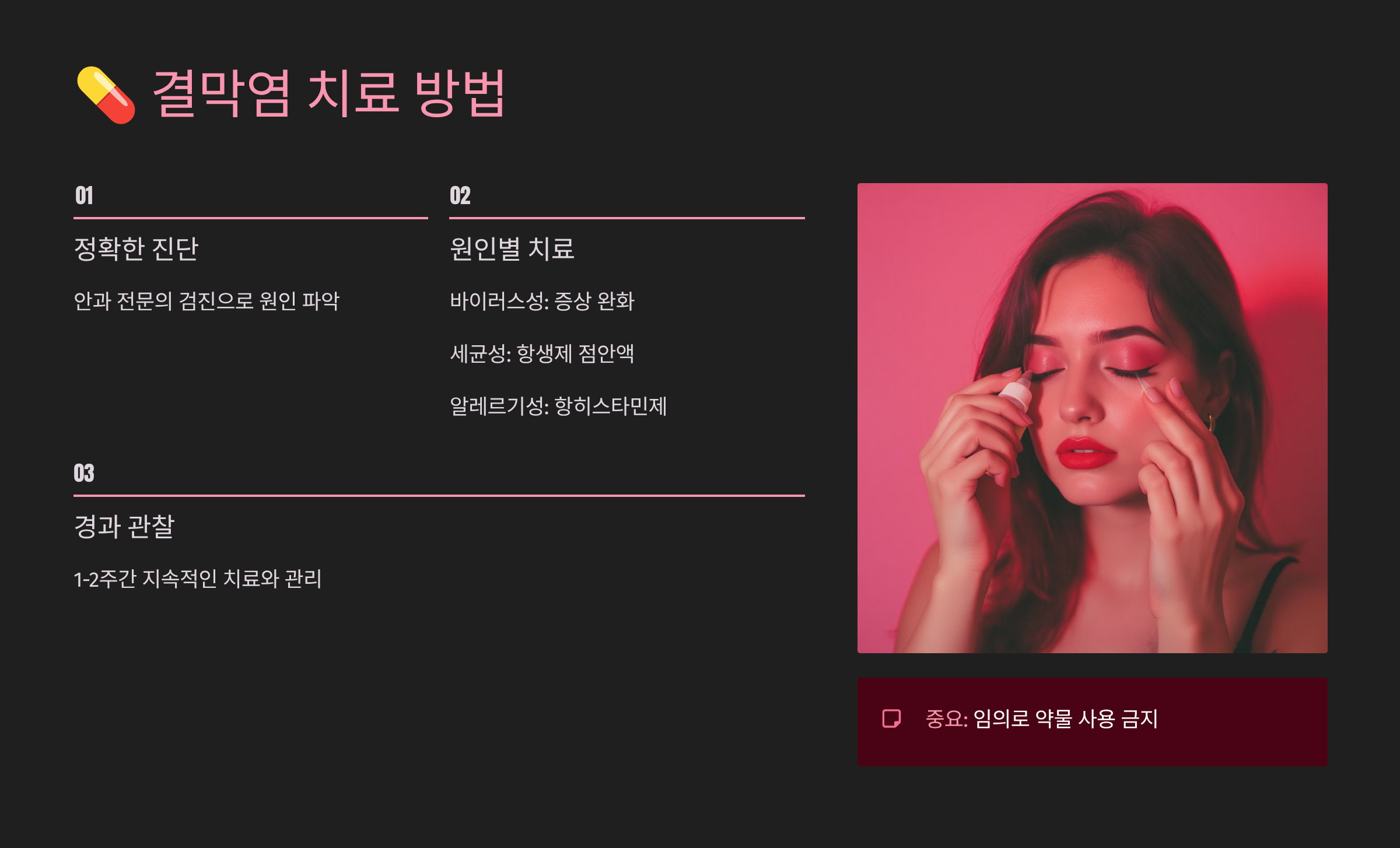 이 글은 일반적인 정보 제공을 목적으로 작성되었으며, 의학적 조언을 대체할 수 없습니다. 결막염 증상이 있으시다면 반드시 안과 전문의의 진료를 받으시기 바랍니다. 개인의 건강 상태에 따라 치료 방법이 달라질 수 있으므로, 자가 진단이나 자가 치료는 피하시고 전문가의 도움을 받으세요.