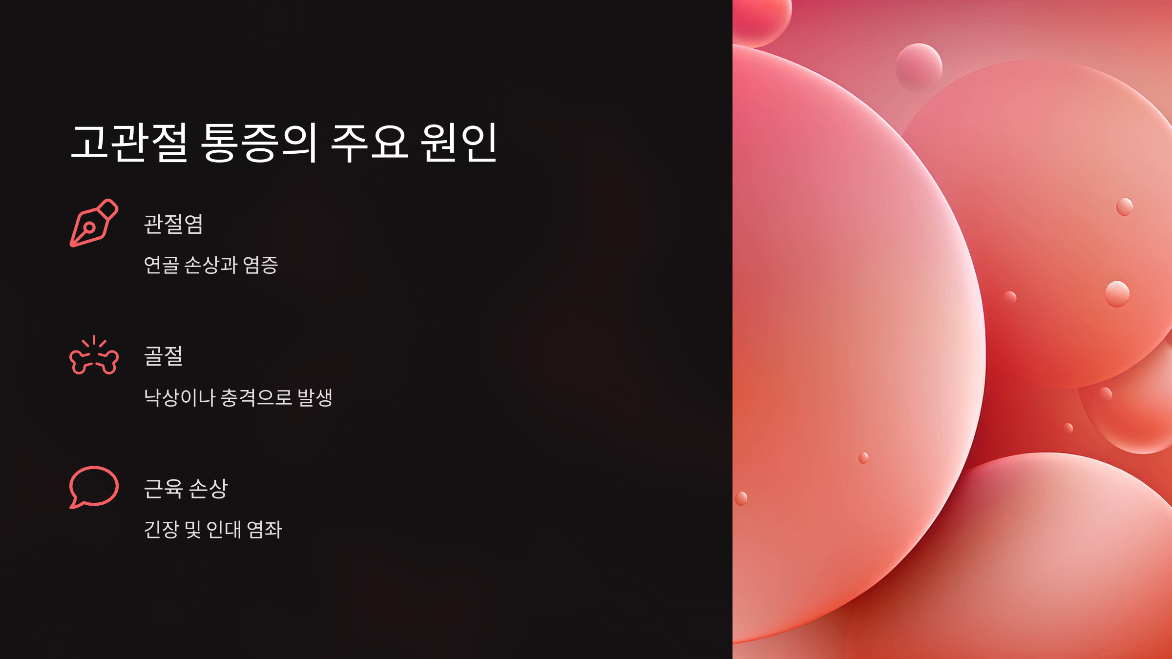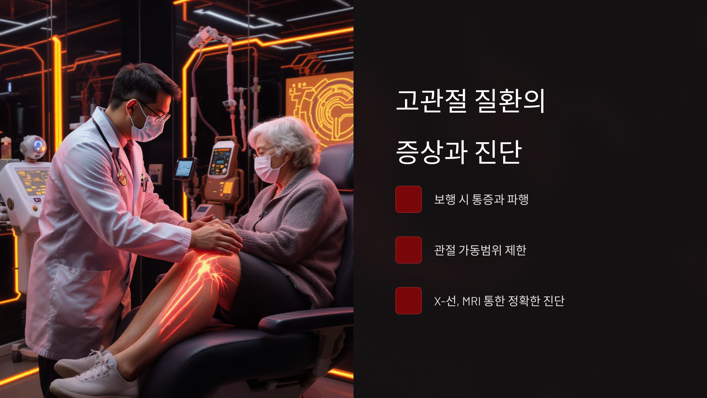 | X-ray | 뼈 구조 확인 | 관절염, 골절 진단 |