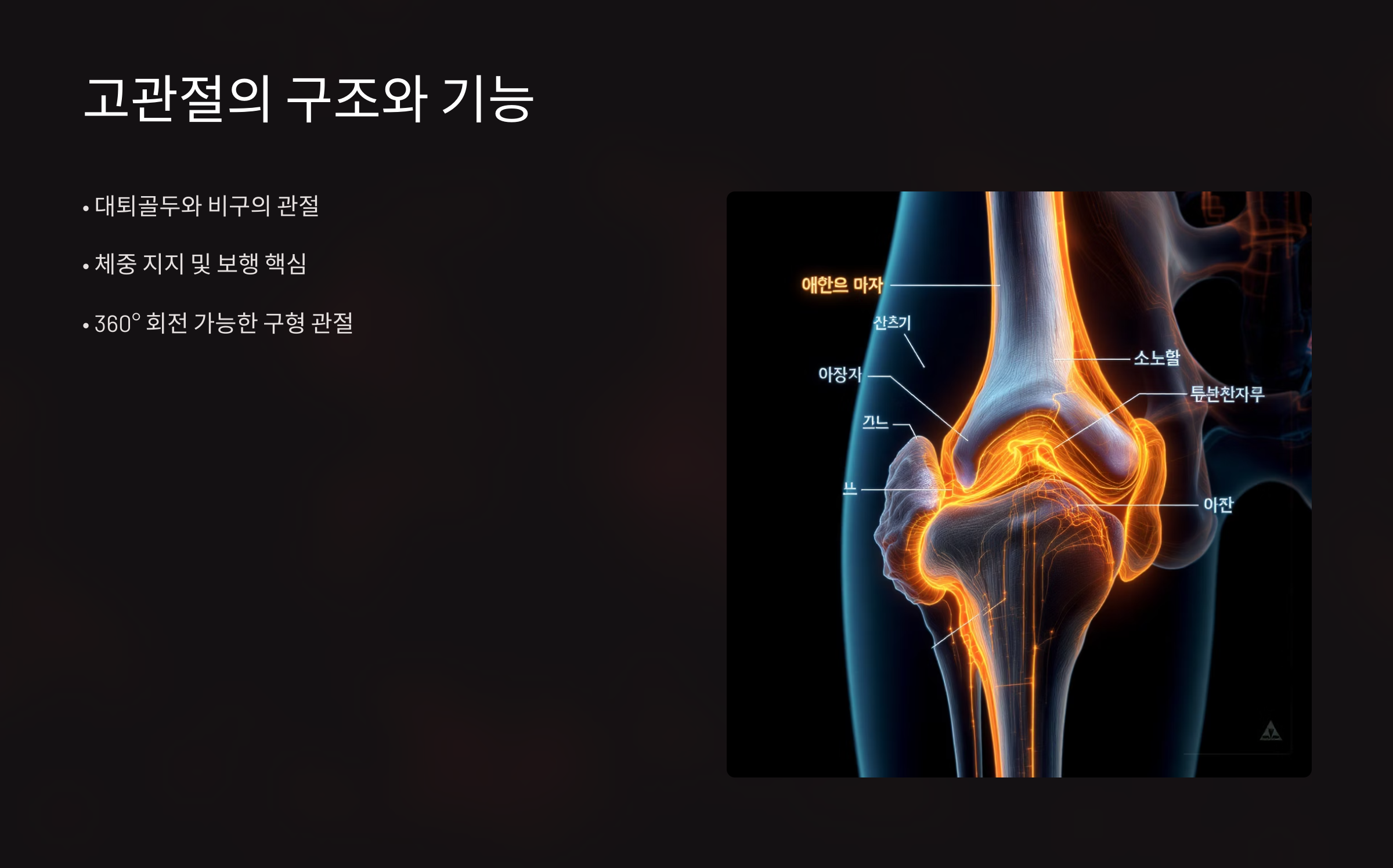 고관절은 골반의 비구와 대퇴골두가 만나서 이루어지는 관절이에요. 비구는 반달 모양의 오목한 부분이고, 대퇴골두는 공 모양으로 되어 있어서 완벽한 구형 관절을 형성하죠. 이 두 뼈 사이에는 연골이 있어서 뼈끼리 직접 부딪치지 않도록 보호해 준답니다. 관절낭이라는 주머니가 전체 관절을 감싸고 있고, 그 안에는 윤활액이 들어있어서 부드러운 움직임을 가능하게 해요.