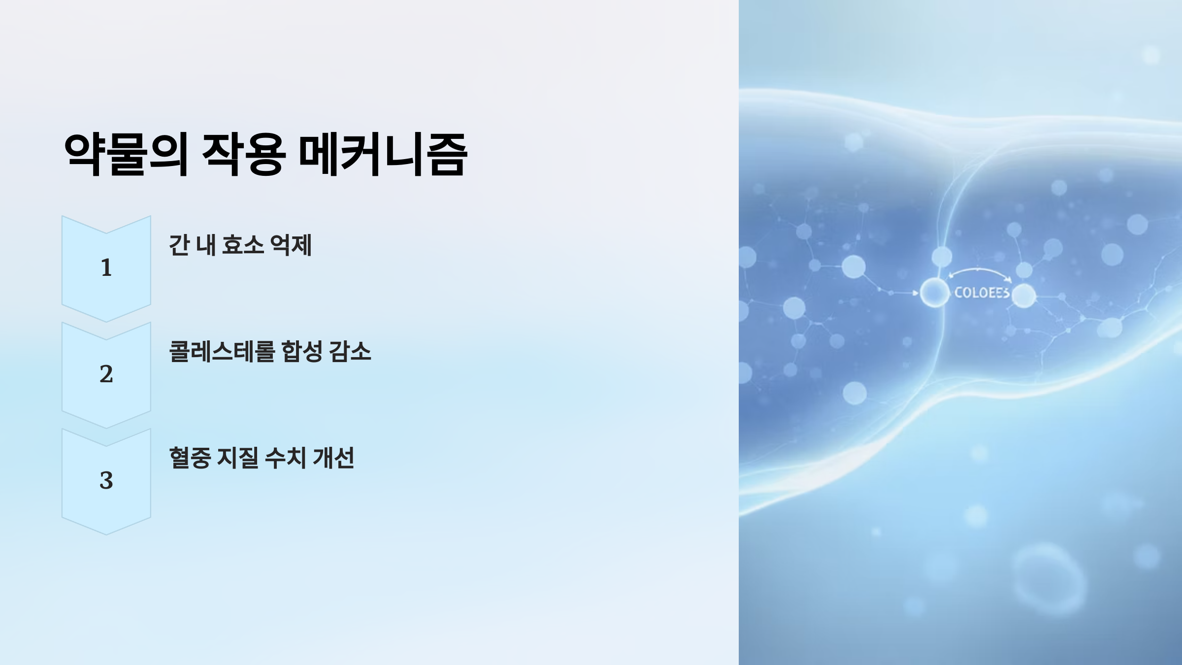 고지혈증 약들은 각각 독특한 방식으로 우리 몸의 지질 대사에 관여해요. 스타틴의 경우, HMG-CoA 환원효소라는 콜레스테롤 합성의 핵심 효소를 억제해요. 이 효소가 차단되면 간세포는 콜레스테롤이 부족하다고 인식하고, 혈액 속의 LDL 콜레스테롤을 더 많이 흡수하게 되죠. 결과적으로 혈중 LDL 콜레스테롤이 감소하게 돼요.