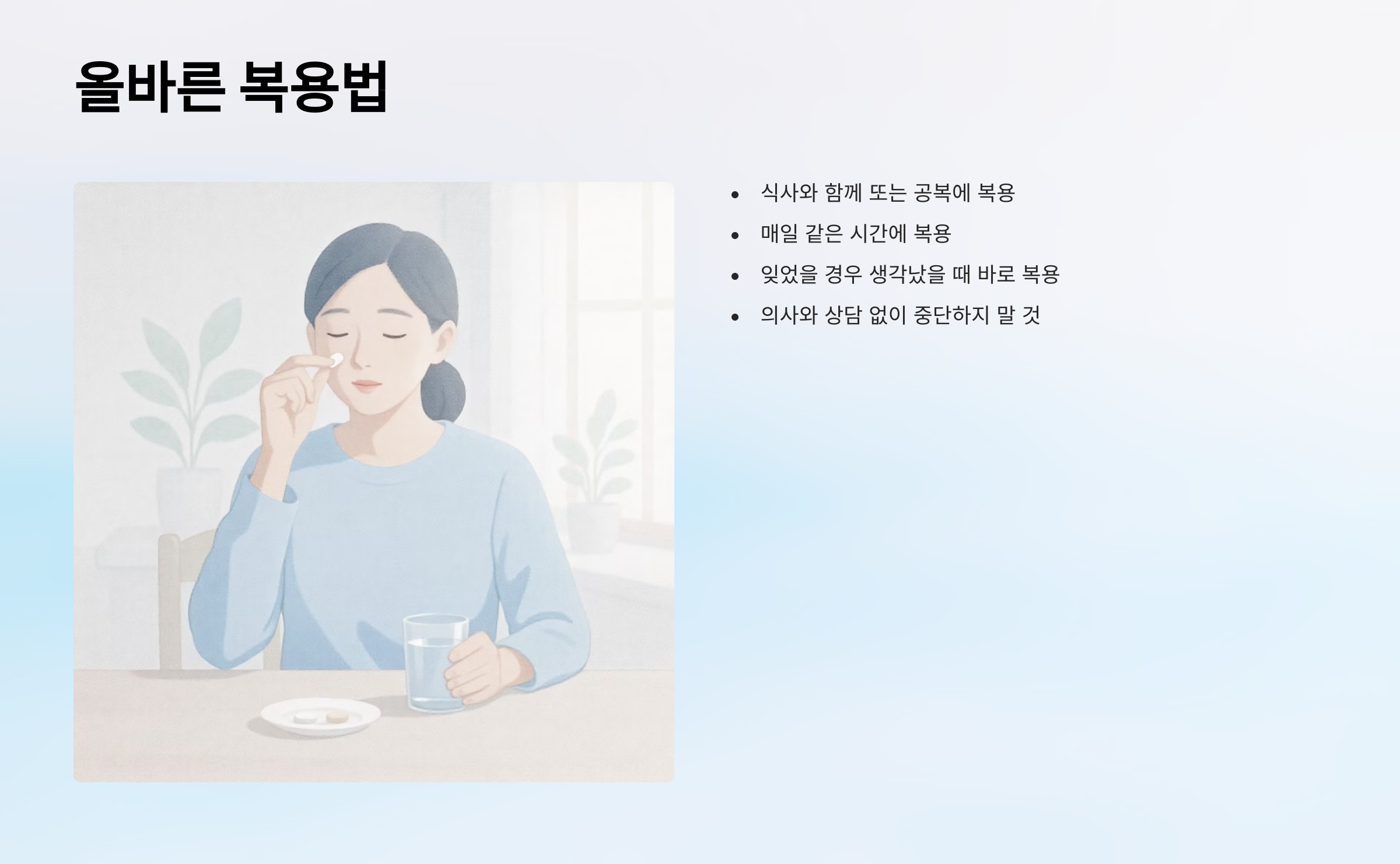 | 약물 | 복용 시간 | 식사 관계 | 특별 주의사항 |