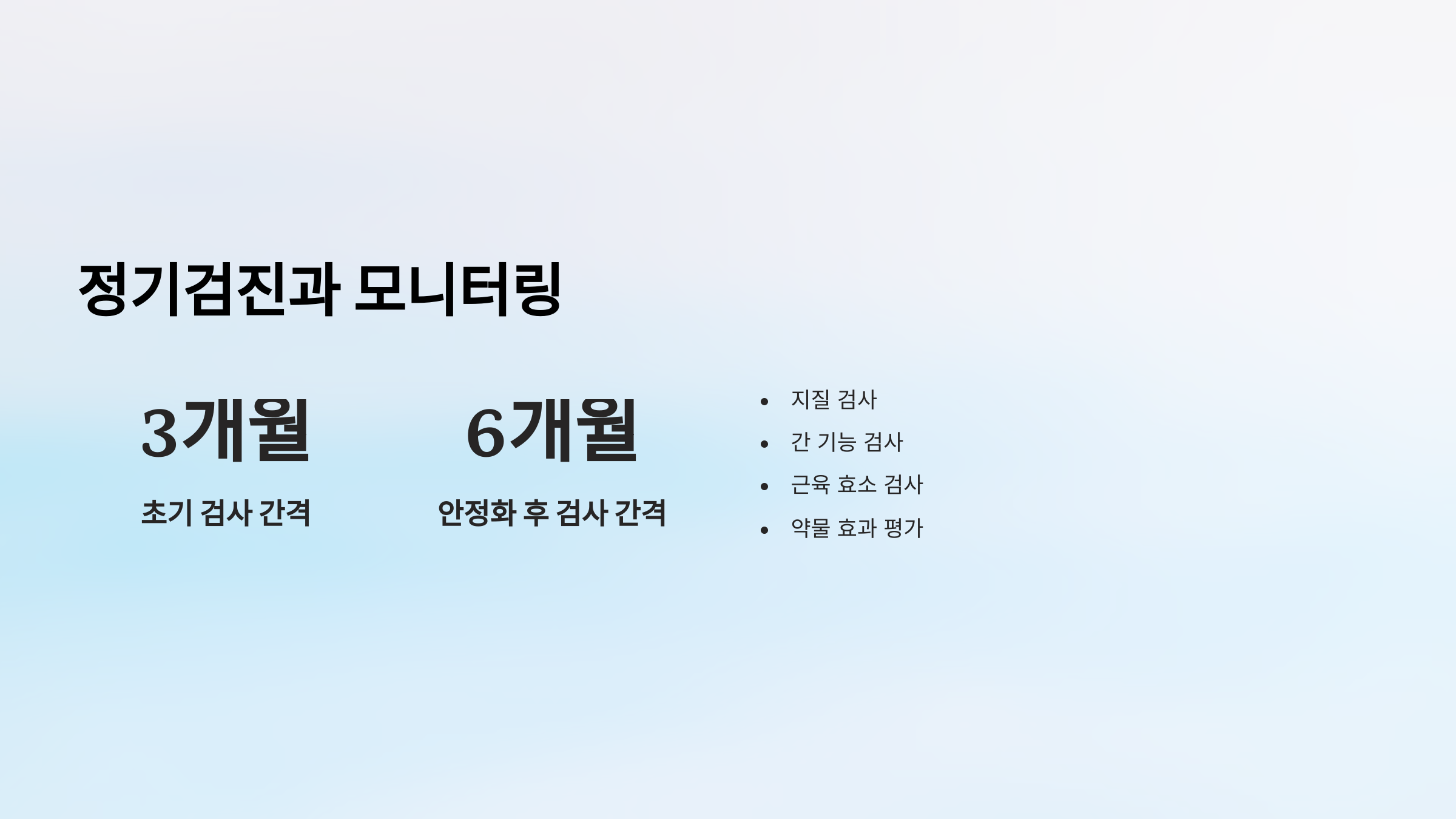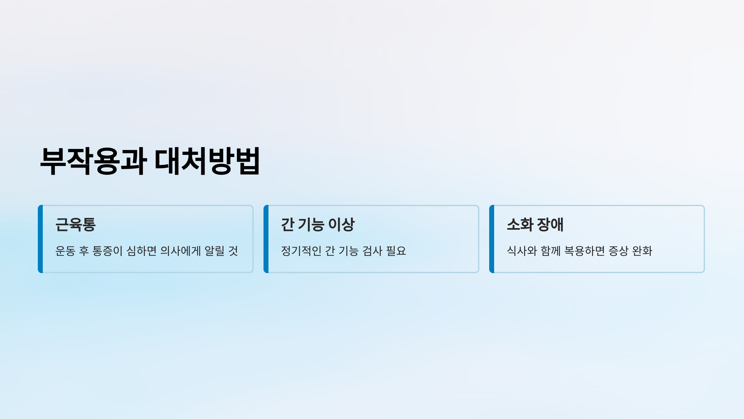 부작용 예방을 위한 생활습관도 중요해요. 충분한 수분 섭취는 근육 손상을 예방하고 약물 대사를 돕습니다. 규칙적인 가벼운 운동은 근육을 건강하게 유지하는 데 도움이 돼요. 스트레스 관리도 중요한데, 스트레스가 많으면 부작용을 더 심하게 느낄 수 있거든요. 😌