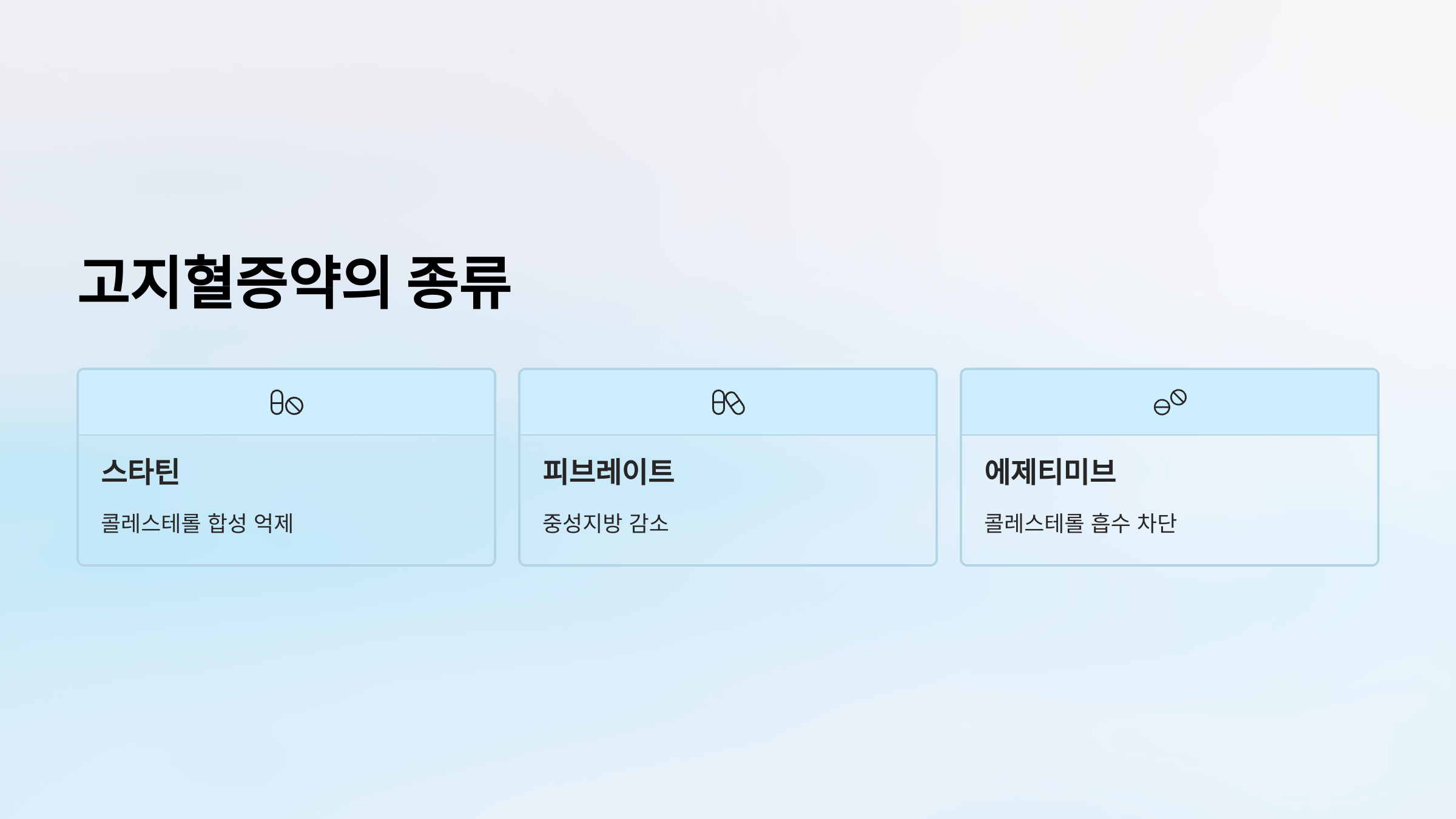 | 스타틴 | 로수바스타틴, 아토르바스타틴 | LDL 20-60% 감소 | 근육통, 간수치 상승 |