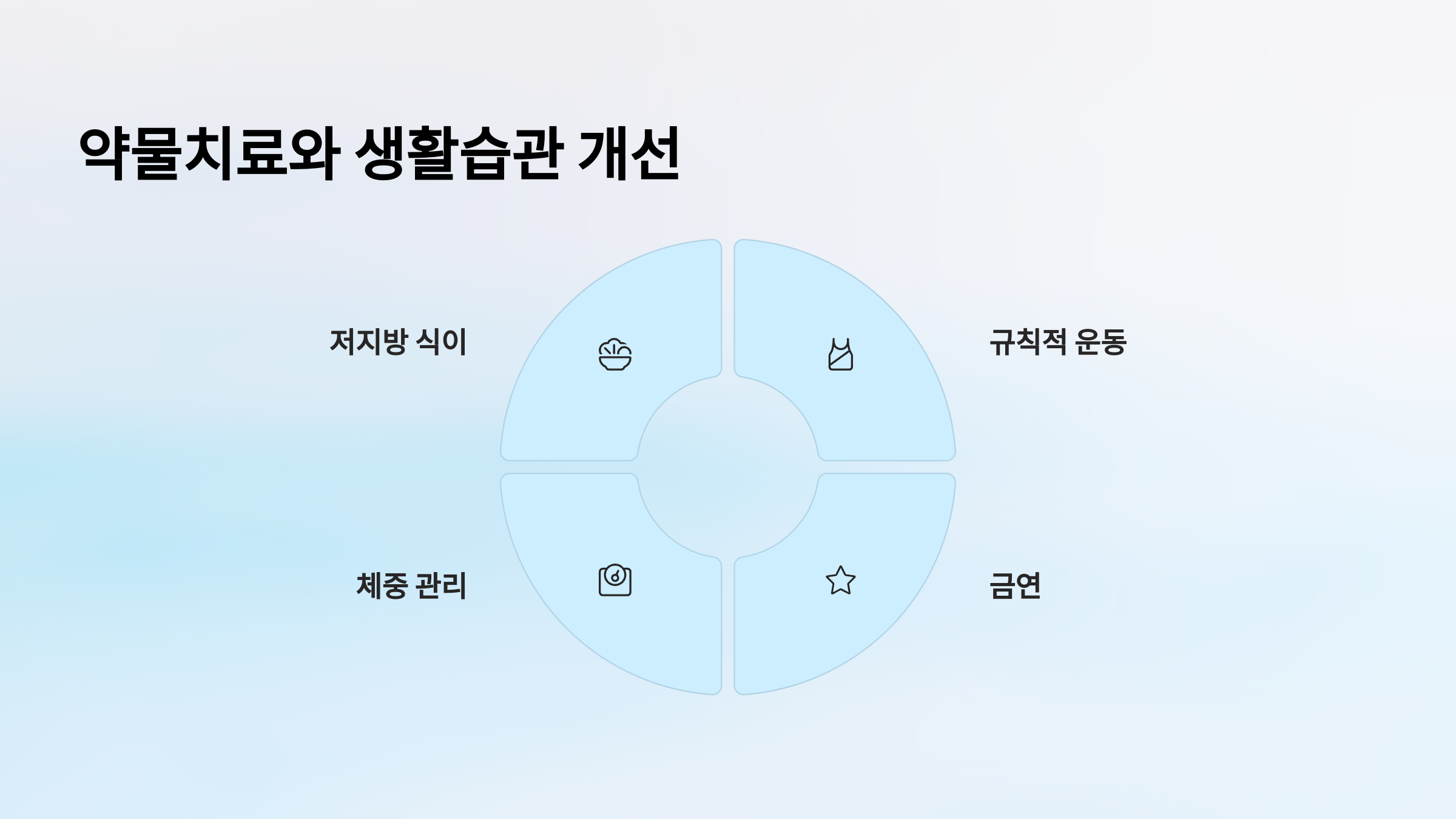 고지혈증 치료에서 약물만큼 중요한 것이 생활습관 개선이에요. 식단 관리는 기본 중의 기본이죠. 포화지방과 트랜스지방을 줄이고, 불포화지방산이 풍부한 음식을 먹는 게 좋아요. 올리브오일, 견과류, 등 푸른 생선 등이 대표적이에요. 하루 콜레스테롤 섭취량은 300mg 이하로 제한하는 게 좋답니다.