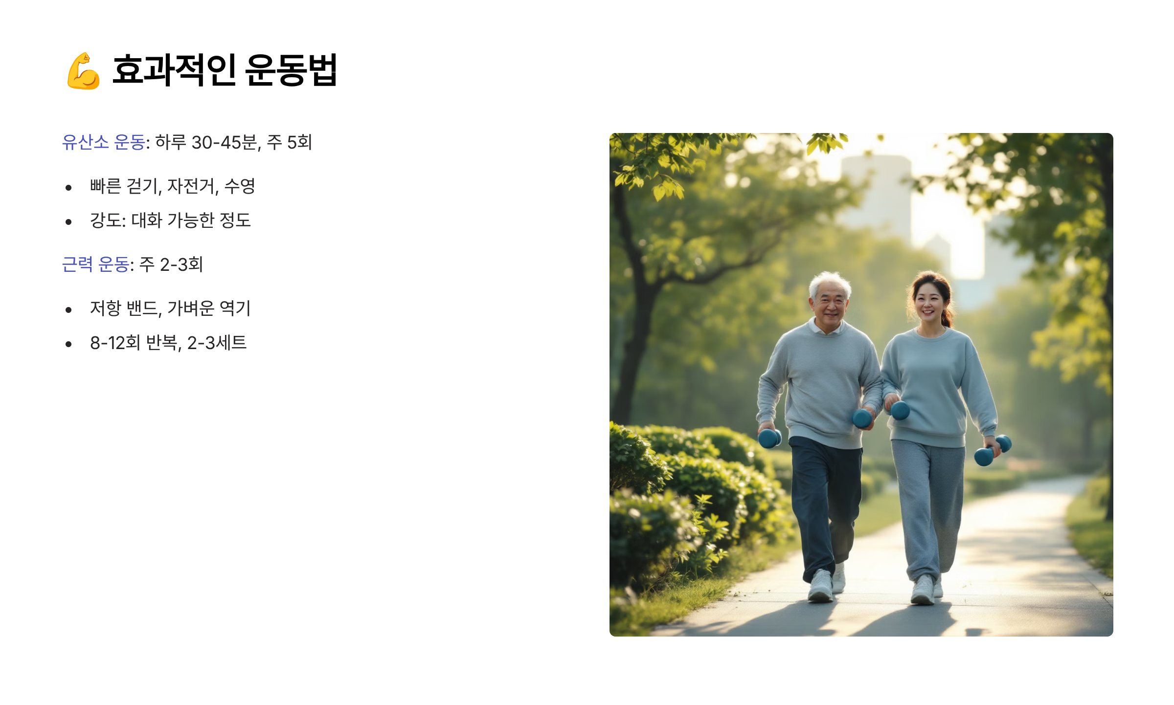 규칙적인 운동은 혈압을 낮추는 가장 효과적인 방법 중 하나예요. 유산소 운동을 주 5회, 하루 30분 이상 하면 수축기 혈압을 5~10mmHg 낮출 수 있답니다. 걷기, 조깅, 수영, 자전거 타기 같은 운동이 특히 좋아요. 운동 강도는 숨이 약간 차지만 대화가 가능한 정도가 적당해요. 처음에는 10분씩 시작해서 점차 시간을 늘려가는 것이 좋답니다.