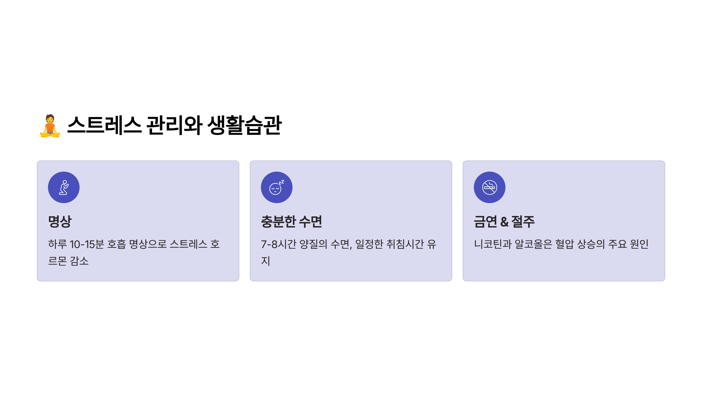 | 수면 | 7-9시간 | 3-5mmHg 감소 |
