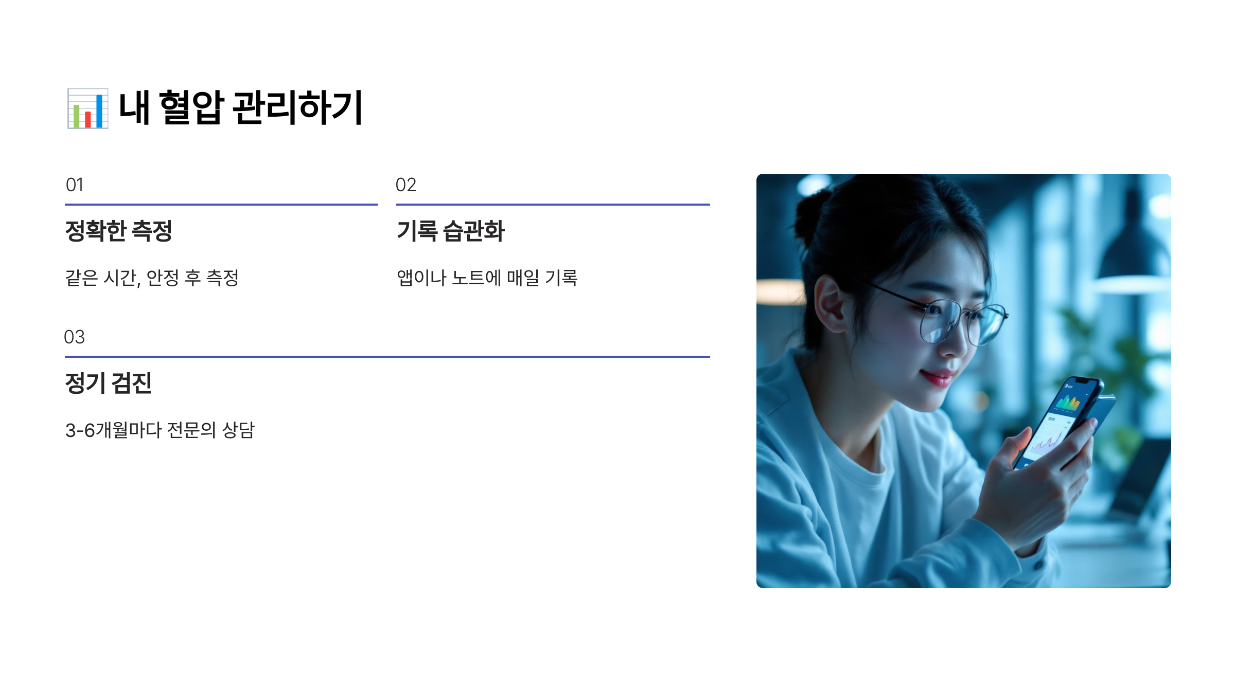 가정 혈압 측정은 고혈압 관리의 기본이에요. 병원에서만 혈압을 측정하면 백의 고혈압 현상으로 정확한 혈압을 알기 어려울 수 있답니다. 가정용 전자 혈압계를 구입해 매일 아침저녁으로 측정하는 것이 좋아요. 측정 전 5분간 안정을 취하고, 카페인이나 담배는 30분 전부터 피해야 정확한 측정이 가능해요.