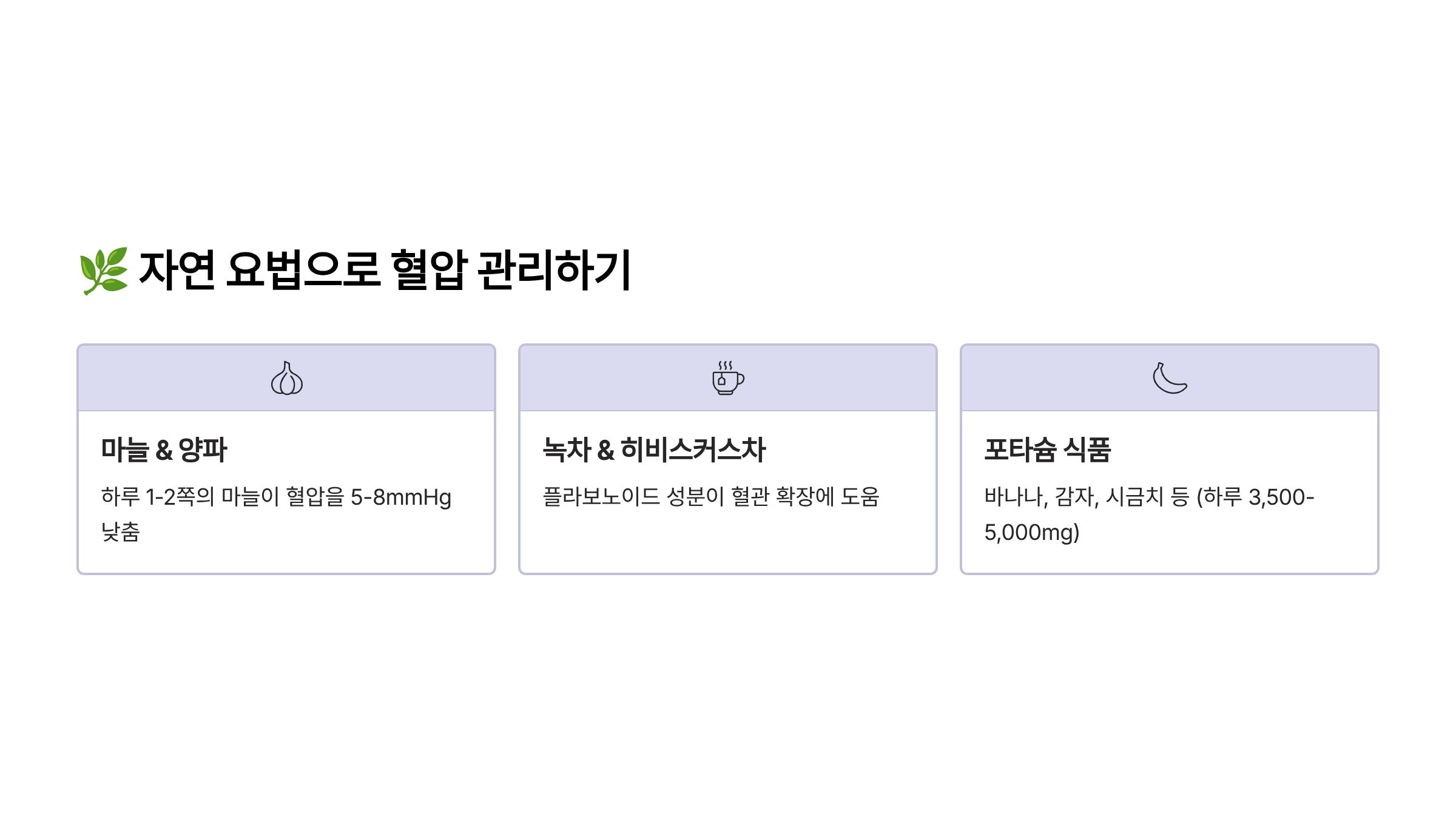 고혈압을 자연적으로 낮추는 방법은 생각보다 다양해요. 먼저 마늘은 천연 혈압강하제로 알려져 있는데, 알리신이라는 성분이 혈관을 확장시켜 혈압을 낮추는 효과가 있답니다. 하루에 생마늘 1~2쪽을 꾸준히 섭취하면 수축기 혈압을 5~10mmHg 정도 낮출 수 있다는 연구 결과도 있어요. 마늘을 그냥 먹기 어렵다면 요리에 활용하거나 마늘 진액으로 섭취하는 것도 좋은 방법이에요.