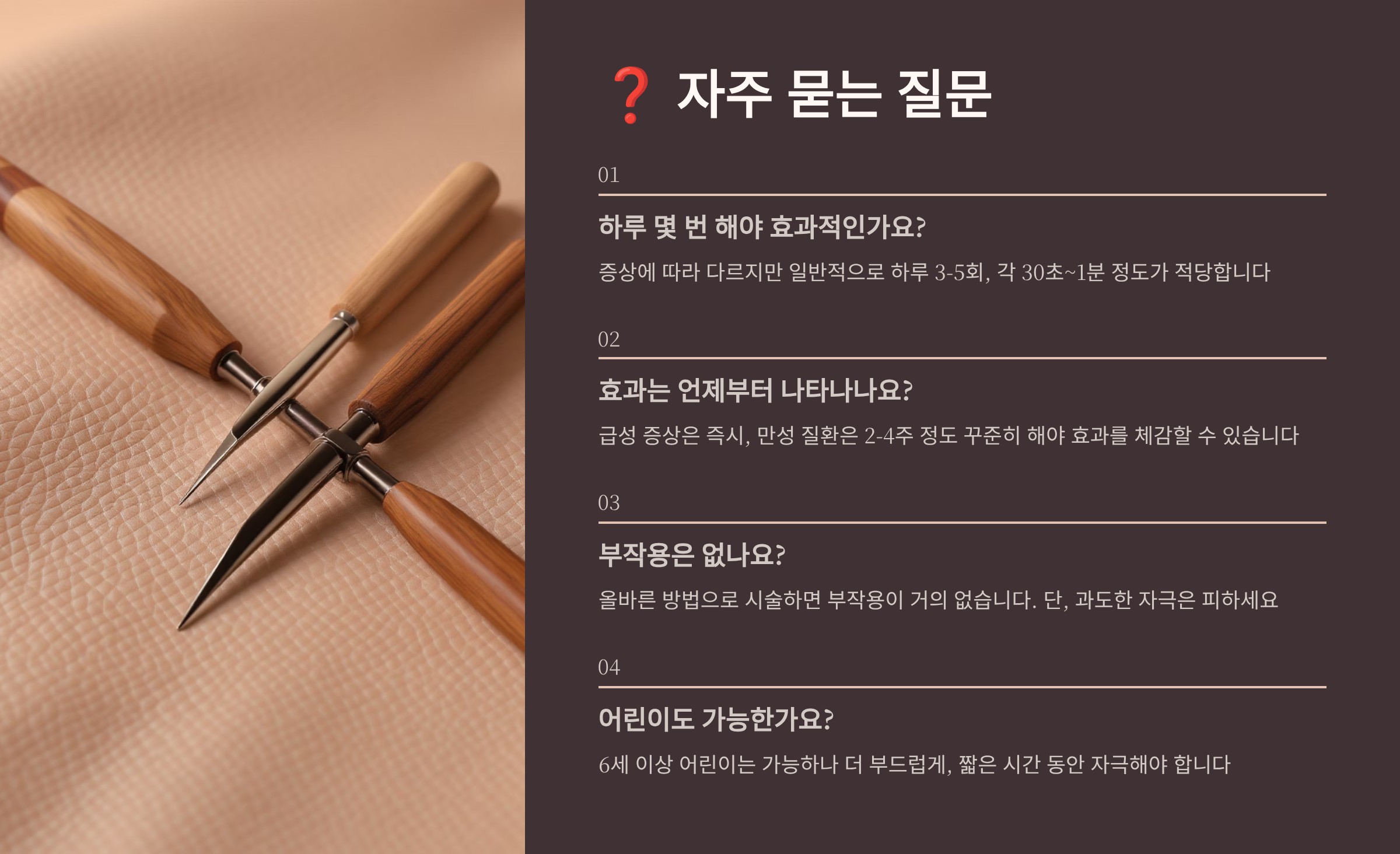 A1. 급성 증상은 하루 2-3회, 만성 질환은 하루 1-2회가 적당해요. 한 번에 5-10분 정도 자극하는 것이 효과적이랍니다.
