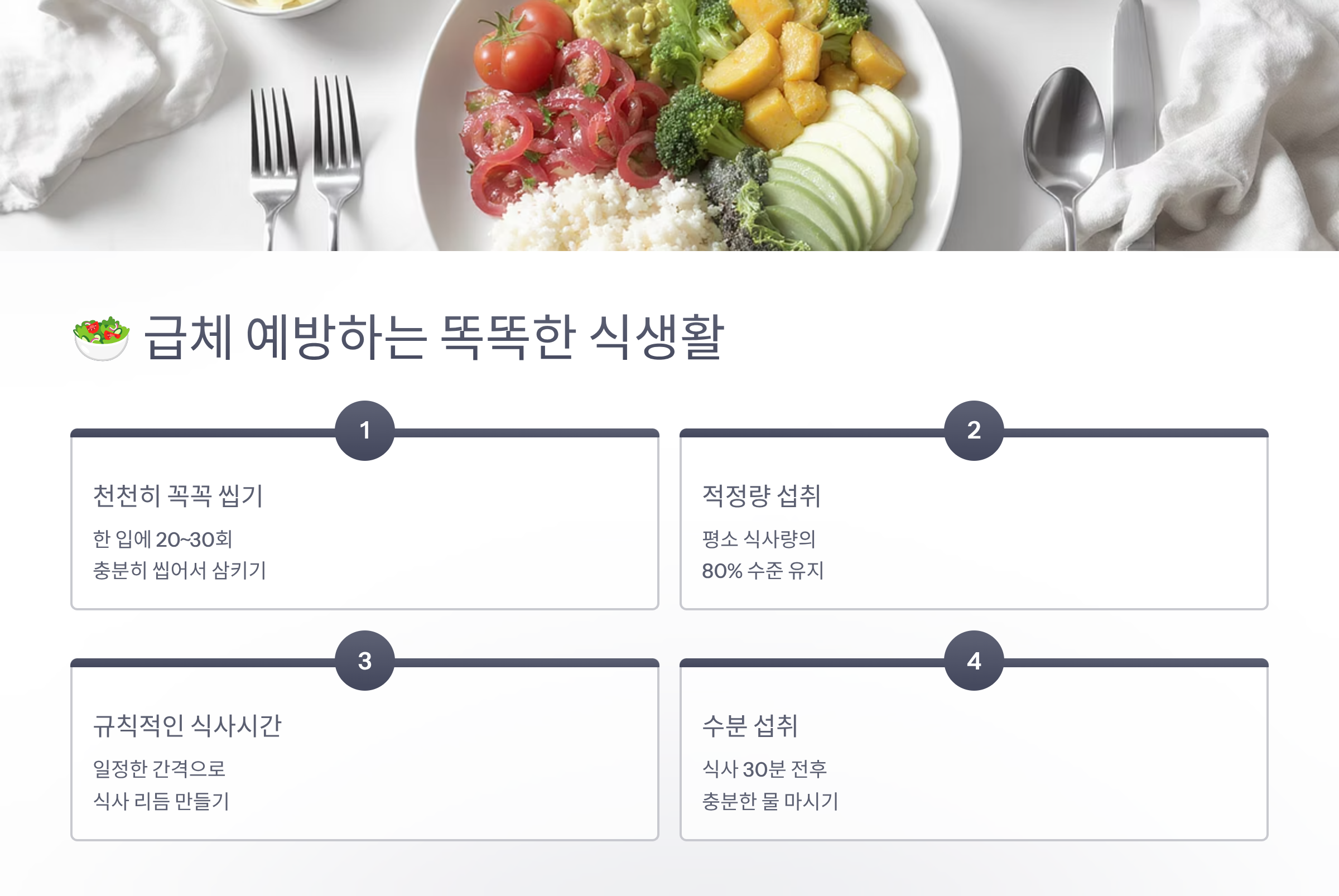급체를 예방하는 가장 중요한 방법은 올바른 식습관을 갖는 거예요. 식사 시간을 최소 20-30분 확보하고, 음식을 30번 이상 씹어서 삼키는 습관을 들이면 급체 발생률이 현저히 줄어들어요. 실제로 일본의 한 연구에서는 한 입에 30번 이상 씹는 습관을 가진 사람들이 그렇지 않은 사람들보다 소화불량 발생률이 60% 낮다는 결과가 나왔어요. 천천히 먹으면 포만감도 빨리 느껴져서 과식도 예방할 수 있답니다!