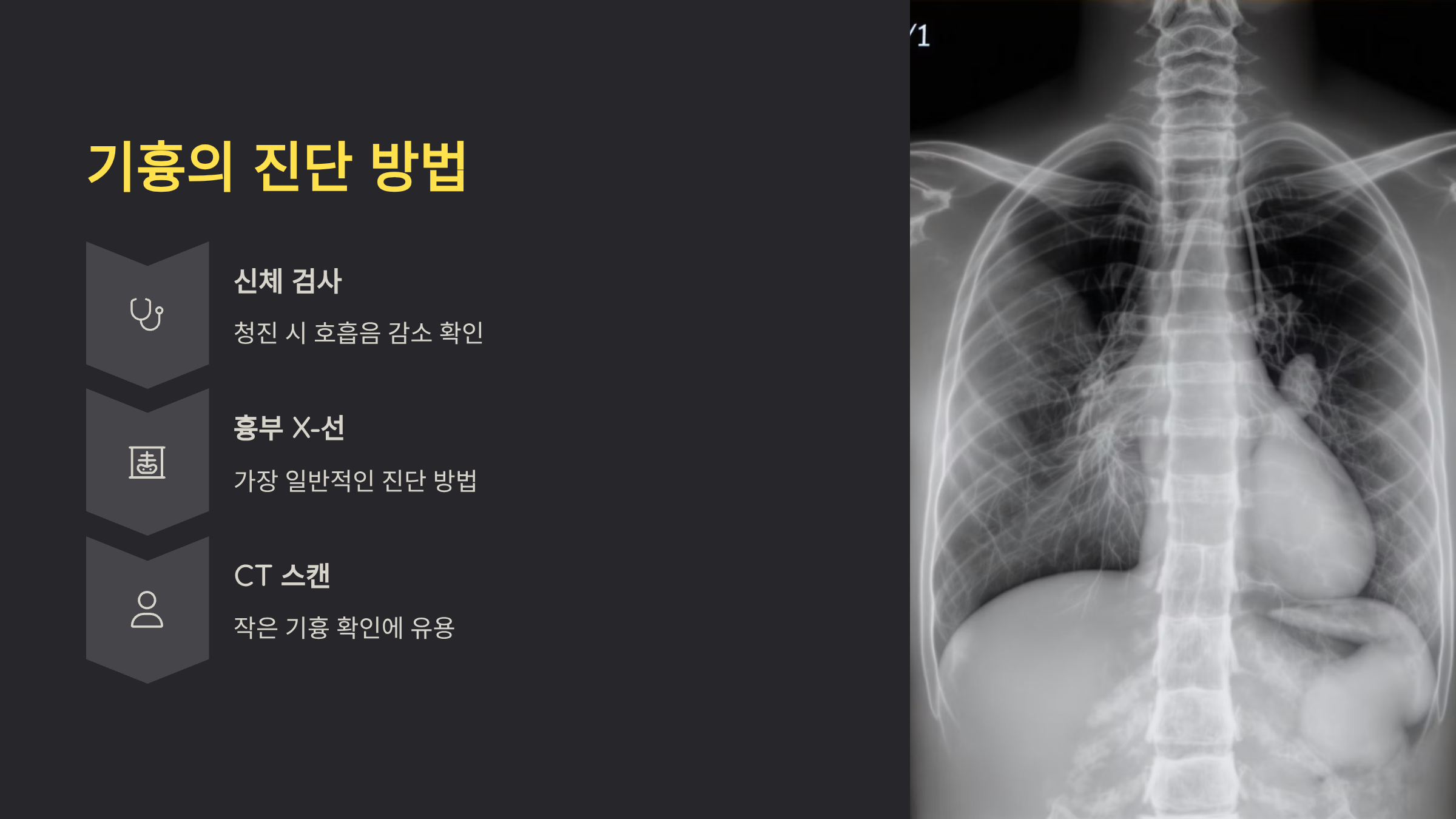 | 흉부 X-ray | 기본 진단 | 빠르고 간편, 작은 기흉 놓칠 수 있음 |