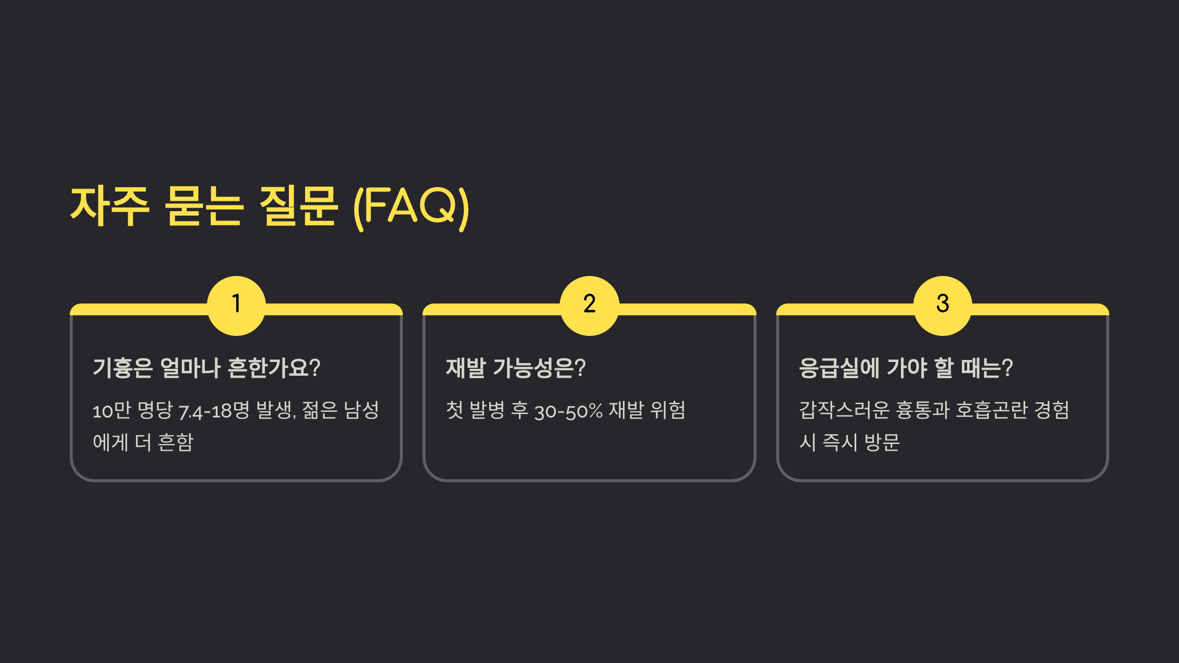 A7. 이전과 비슷한 날카로운 가슴 통증, 갑작스러운 호흡곤란, 마른기침이 나타나면 재발을 의심해야 해요. 증상이 경미하더라도 기흉 병력이 있다면 즉시 병원을 방문하세요. 정기적인 흉부 X-ray 검사로 조기에 발견할 수 있고, 의심 증상이 있으면 지체하지 말고 응급실을 방문하는 것이 좋아요.