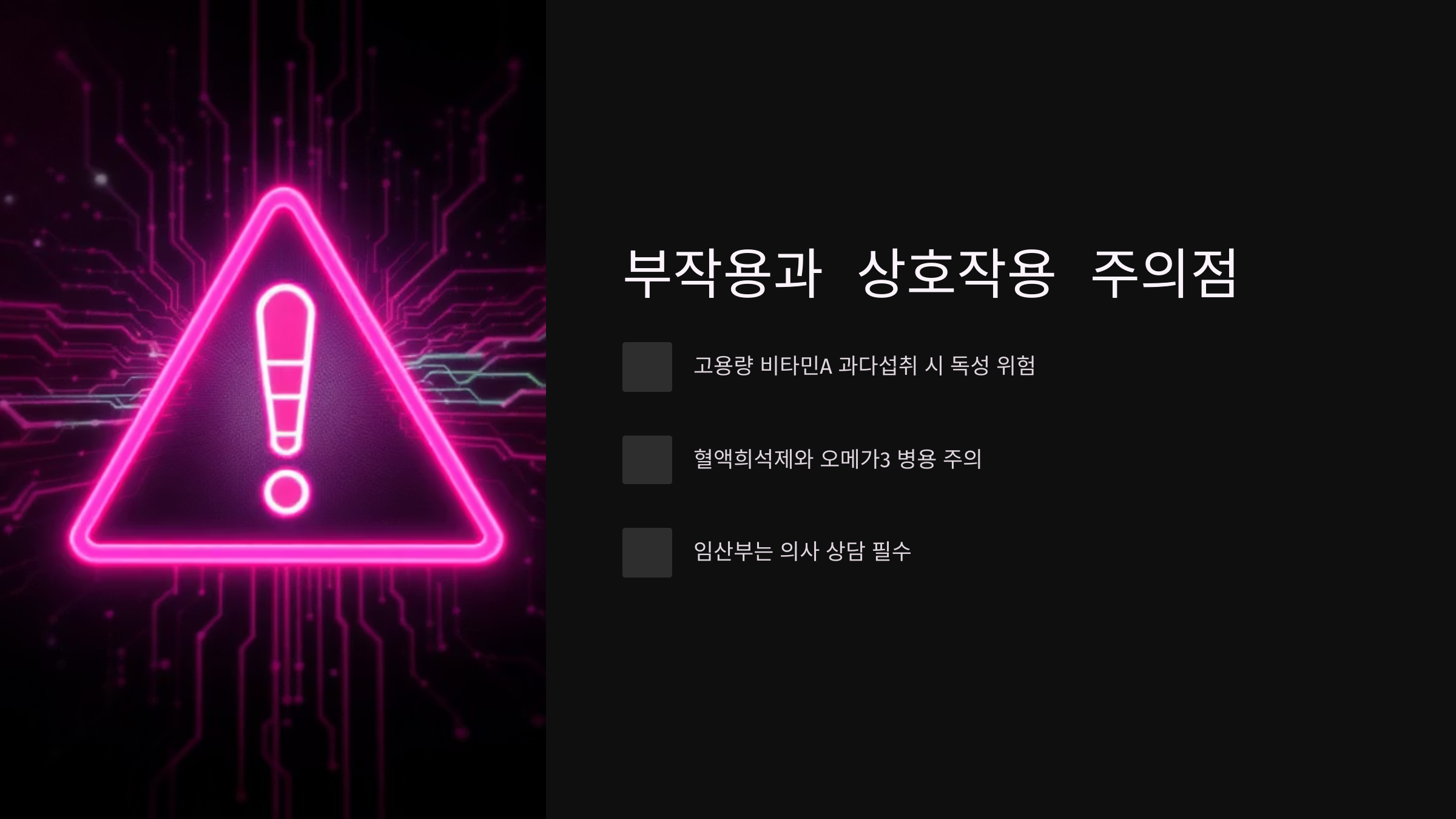 비타민 A는 지용성 비타민으로 체내에 축적될 수 있어 과다 섭취에 주의해야 해요. 두통, 어지러움, 탈모, 간 손상 등의 부작용이 나타날 수 있어요. 특히 임산부는 과다 섭취 시 기형아 출산 위험이 있으므로 더욱 주의가 필요해요. 베타카로틴 형태로 섭취하면 이런 위험을 줄일 수 있답니다.