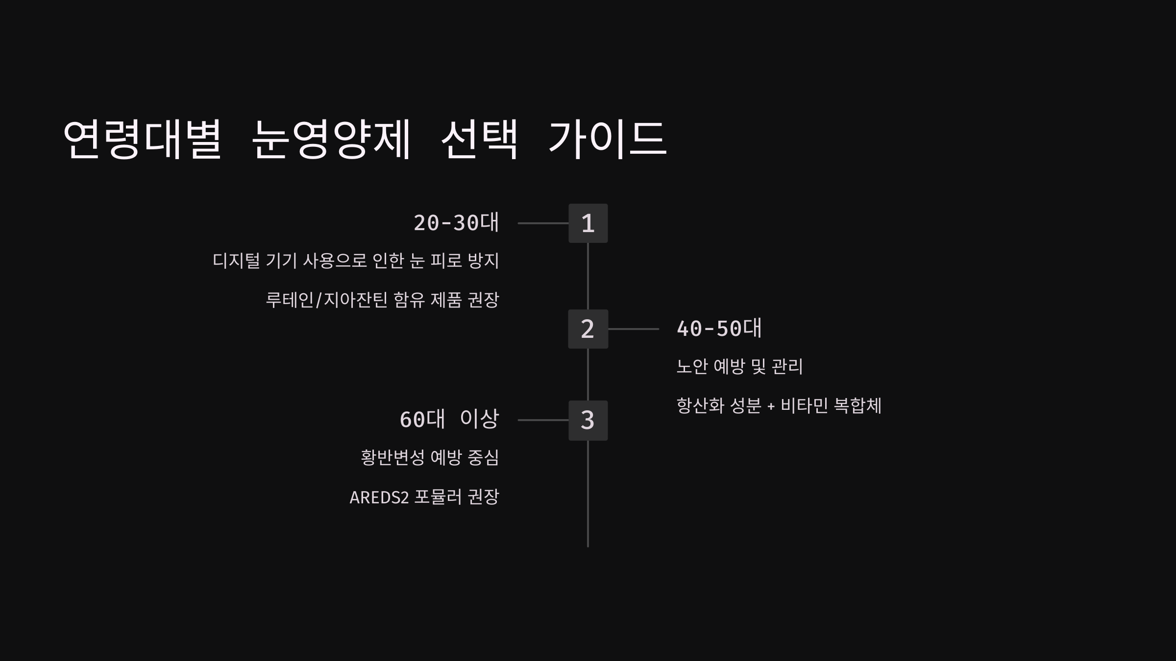 40-50대는 노안이 시작되는 시기로, 황반변성 예방에 신경 써야 해요. AREDS2 포뮬러를 기본으로 한 제품을 선택하는 것이 좋고, 오메가 3도 함께 섭취하면 안구건조증 예방에 도움이 돼요. 이 연령대부터는 정기적인 안과 검진도 필수예요. 가족력이 있다면 더욱 적극적인 관리가 필요하답니다.