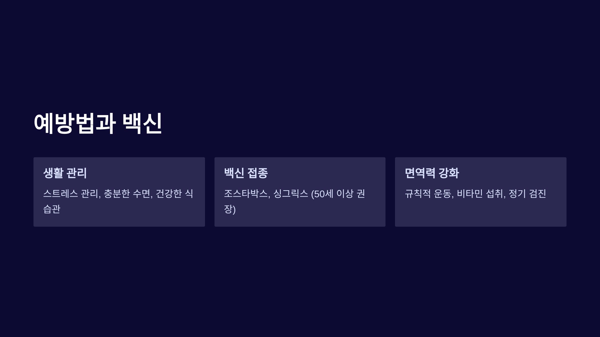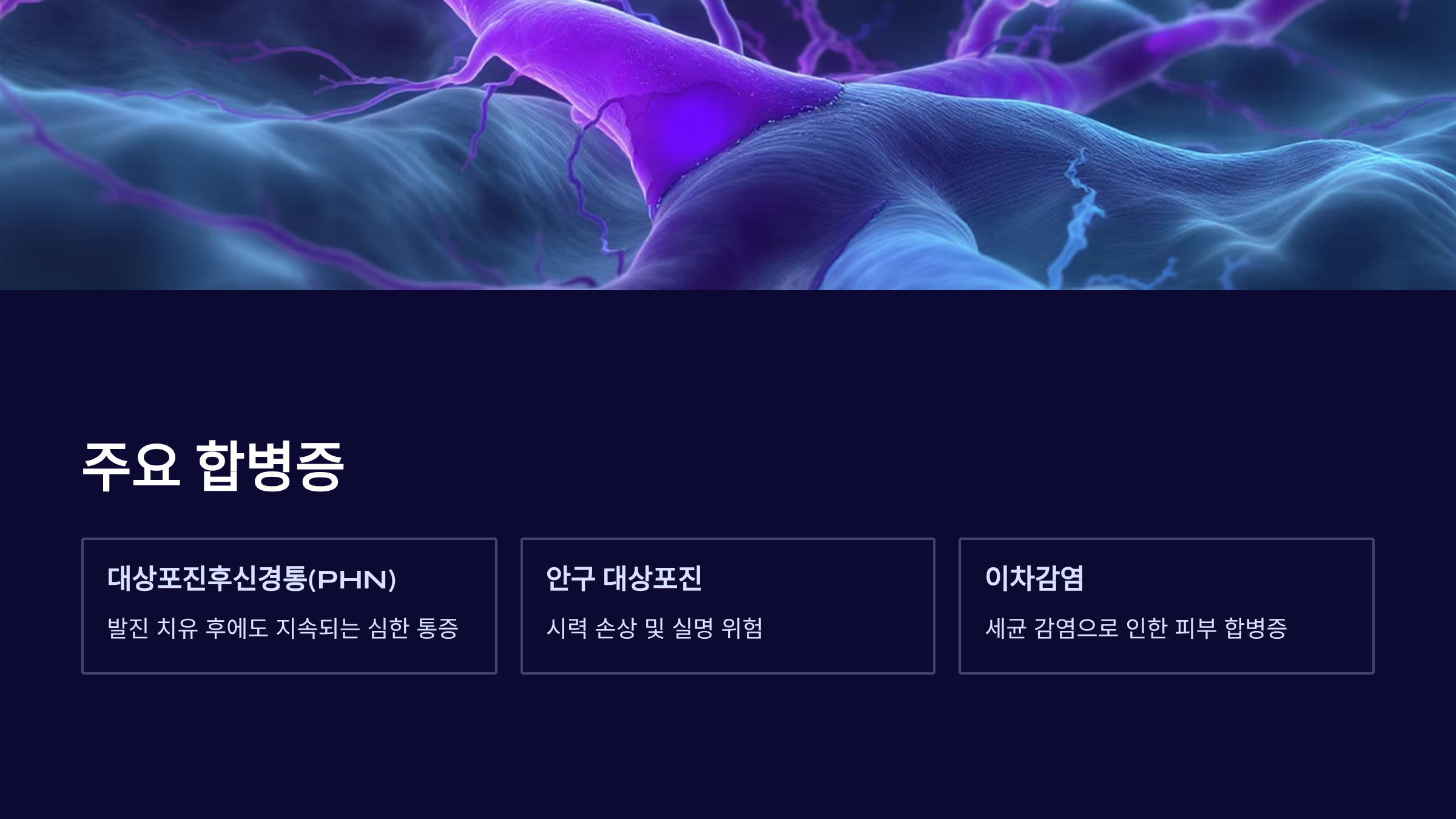면책조항: 이 글은 일반적인 의학 정보를 제공하는 것으로, 개인의 진단이나 치료를 대체할 수 없습니다. 대상포진 증상이 의심되면 반드시 의료 전문가와 상담하시기 바랍니다. 본 정보는 2025년 1월 기준으로 작성되었으며, 의학적 권고사항은 변경될 수 있습니다.