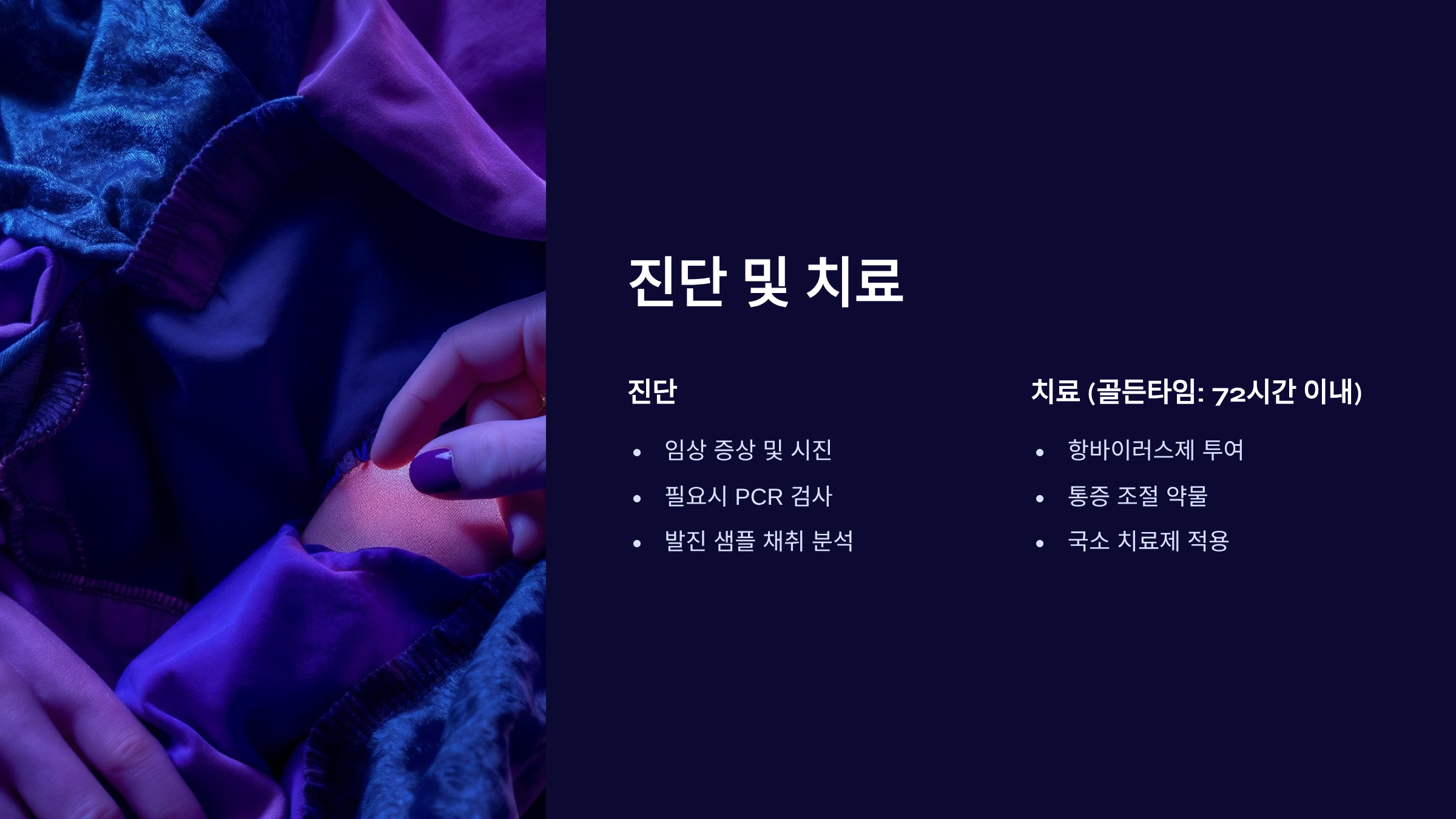 대상포진 치료의 핵심은 '골든타임'이에요. 발진이 나타난 후 72시간 이내에 항바이러스제 치료를 시작해야 최상의 효과를 볼 수 있답니다. 이 시기를 놓치면 치료 효과가 떨어지고, 대상포진 후 신경통 같은 합병증 위험이 높아져요. 그래서 의심 증상이 나타나면 즉시 병원을 방문하는 것이 중요해요.