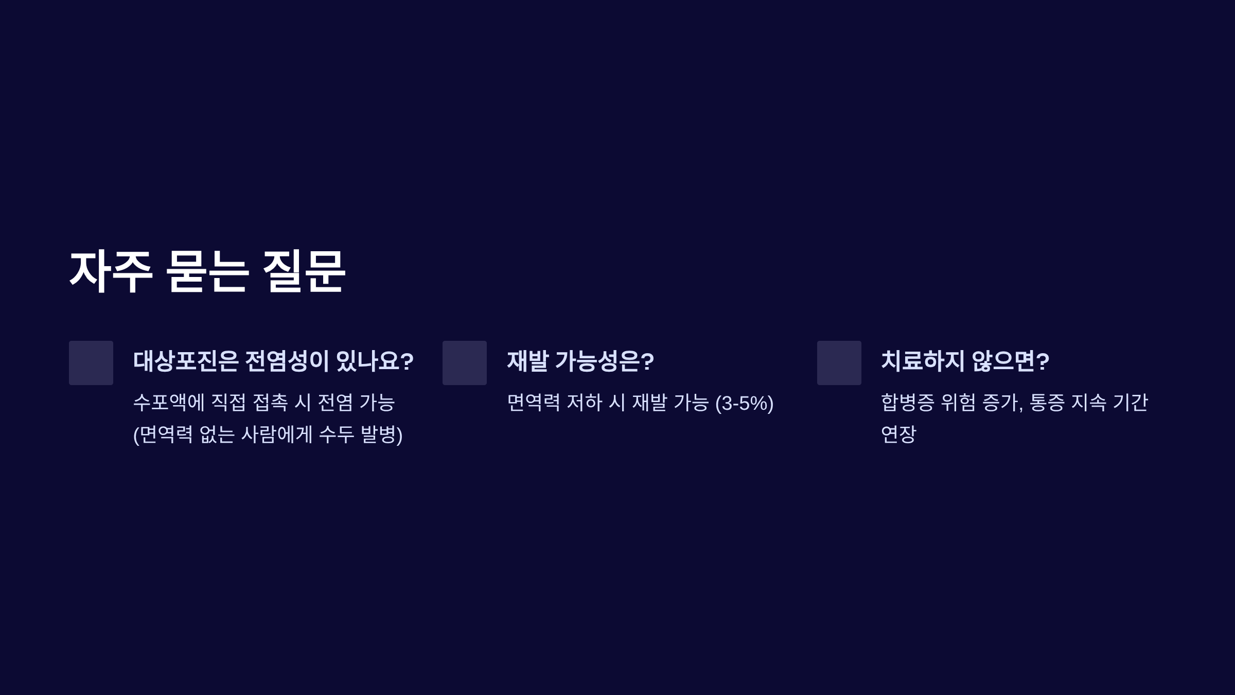A2. 네, 재발할 수 있어요. 일반적으로 재발률은 5% 정도로 낮지만, 면역력이 떨어진 사람은 재발 위험이 더 높아요. 첫 발병 후 평균 3-5년 후에 재발하는 경우가 많고, 같은 부위나 다른 부위에 나타날 수 있어요. 재발 방지를 위해서는 면역력 관리와 예방접종이 중요해요.