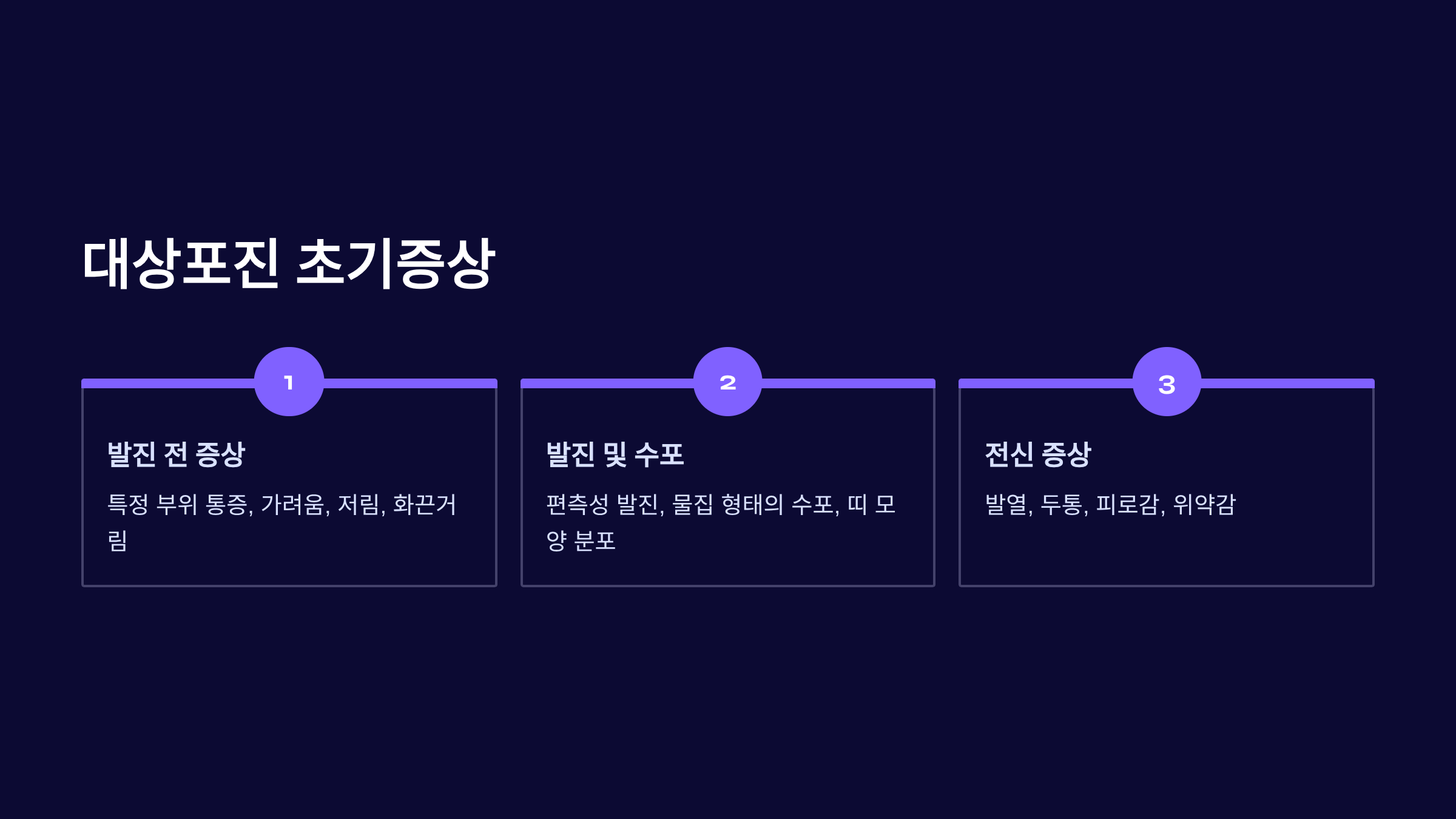 초기에는 미열이 나거나 두통, 전신 피로감 같은 전구증상이 나타날 수 있어요. 특히 해당 부위의 피부가 예민해지고, 옷이 스치기만 해도 불편함을 느끼는 경우가 많답니다. 이런 증상이 나타난 후 48-72시간 이내에 붉은 반점들이 나타나기 시작해요. 처음에는 작은 붉은 점처럼 보이다가 점차 물집으로 변하게 되죠.