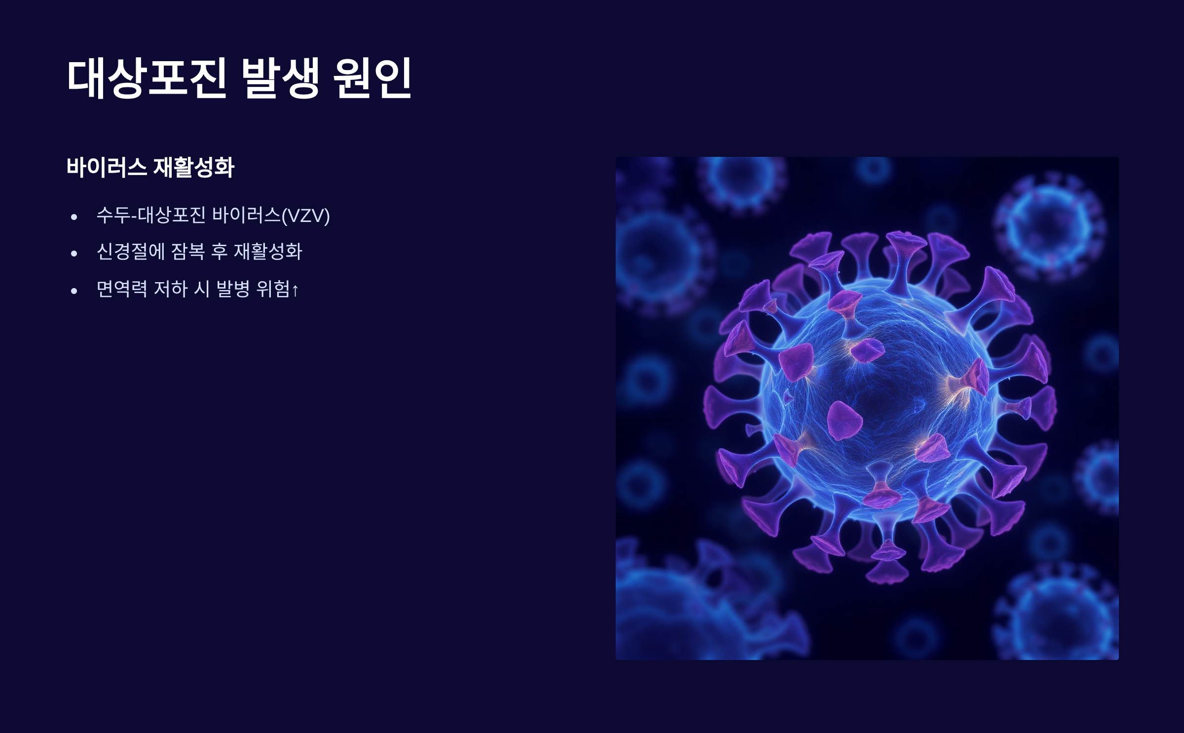 대상포진은 어릴 때 걸렸던 수두 바이러스가 몸속에 잠복해 있다가 면역력이 떨어졌을 때 재활성화되어 발생해요. 수두를 앓은 후 바이러스는 완전히 사라지지 않고 척수 근처의 신경절에 숨어있다가, 우리 몸의 방어력이 약해지면 다시 활동을 시작하는 거죠. 이것이 바로 대상포진이 신경을 따라 나타나는 이유랍니다.