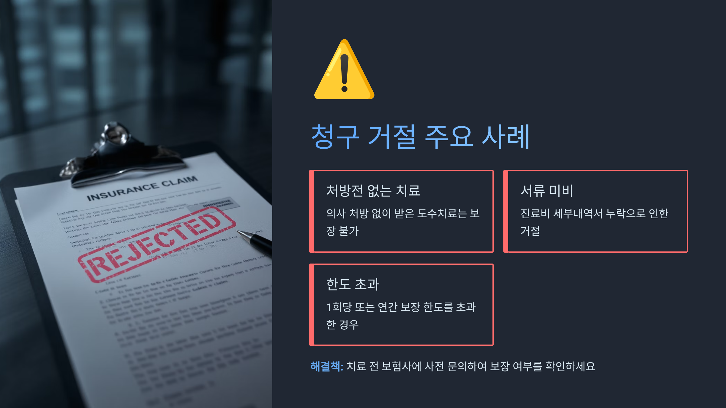 예방이 최선의 방법이에요. 치료 시작 전에 보험사에 사전 문의를 하면 거절 위험을 줄일 수 있어요. 특히 고액이나 장기 치료가 예상되면 미리 상담받는 것이 좋아요. 보험사 앱의 사전승인 서비스를 활용하면 더욱 안전하게 치료받을 수 있답니다! 🛡️