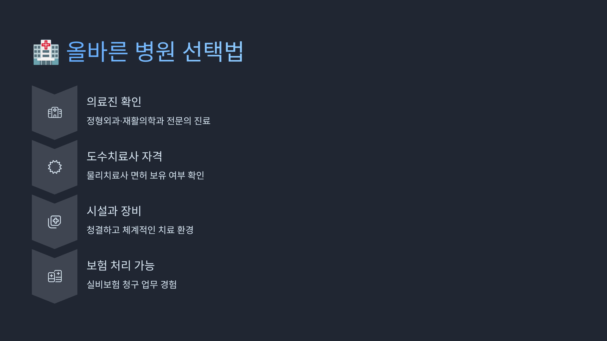 병원 선택 시 도수치료 전문 물리치료사가 있는지 확인하세요. 정식 자격증을 보유한 물리치료사가 시행하는 치료만 실비 인정을 받을 수 있어요. 일부 마사지샵이나 체형교정센터는 의료기관이 아니라서 실비 청구가 불가능해요. 병원 홈페이지나 전화로 미리 확인하는 것이 좋아요.
