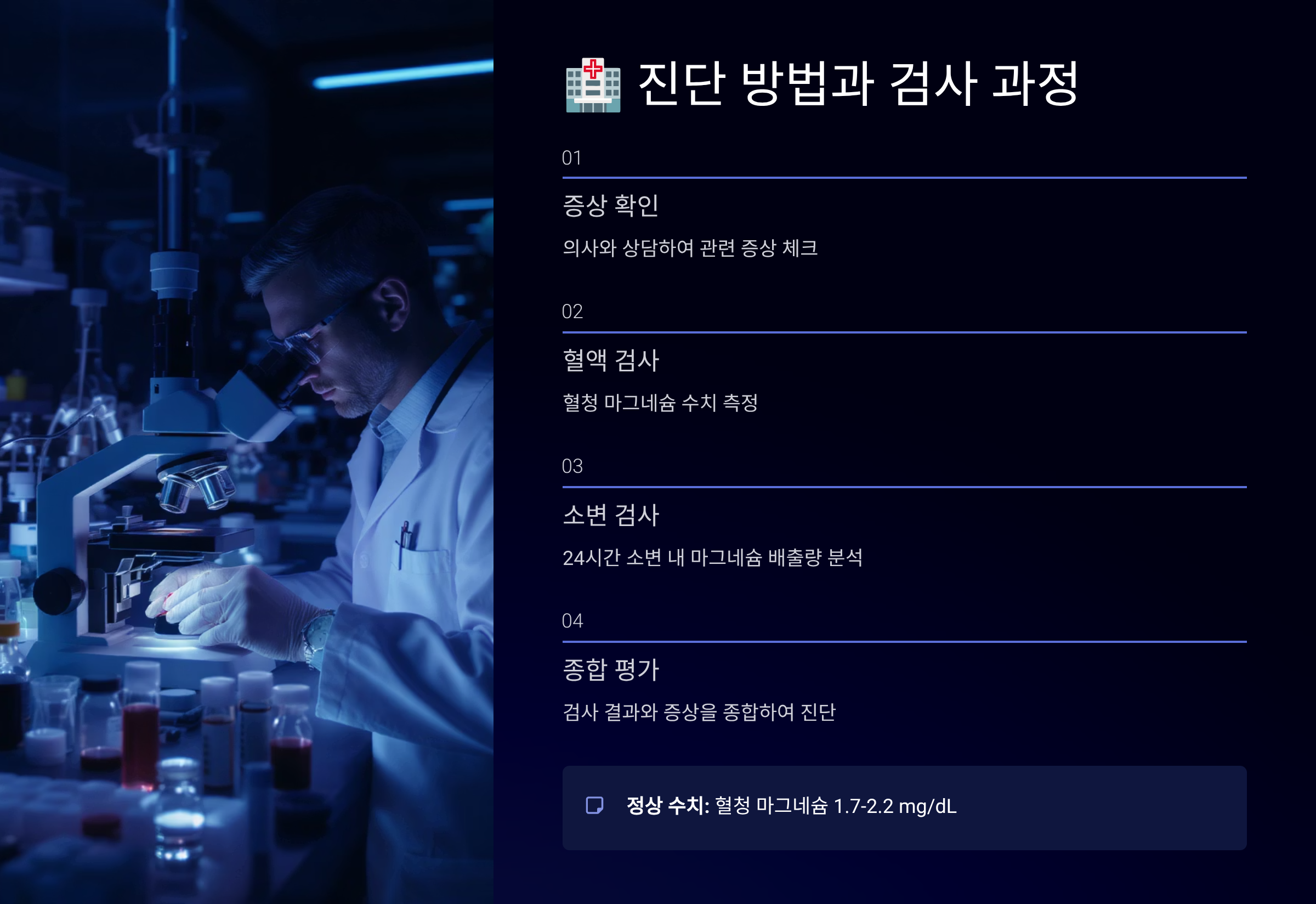 마그네슘 부족을 정확히 진단하는 것은 생각보다 어려워요. 혈청 마그네슘 검사가 가장 일반적이지만, 체내 마그네슘의 1%만 혈액에 존재하기 때문에 정확도가 떨어져요. 혈청 수치가 정상이어도 세포 내 마그네슘이 부족할 수 있답니다. 그래서 증상과 병력을 종합적으로 평가하는 것이 중요해요.