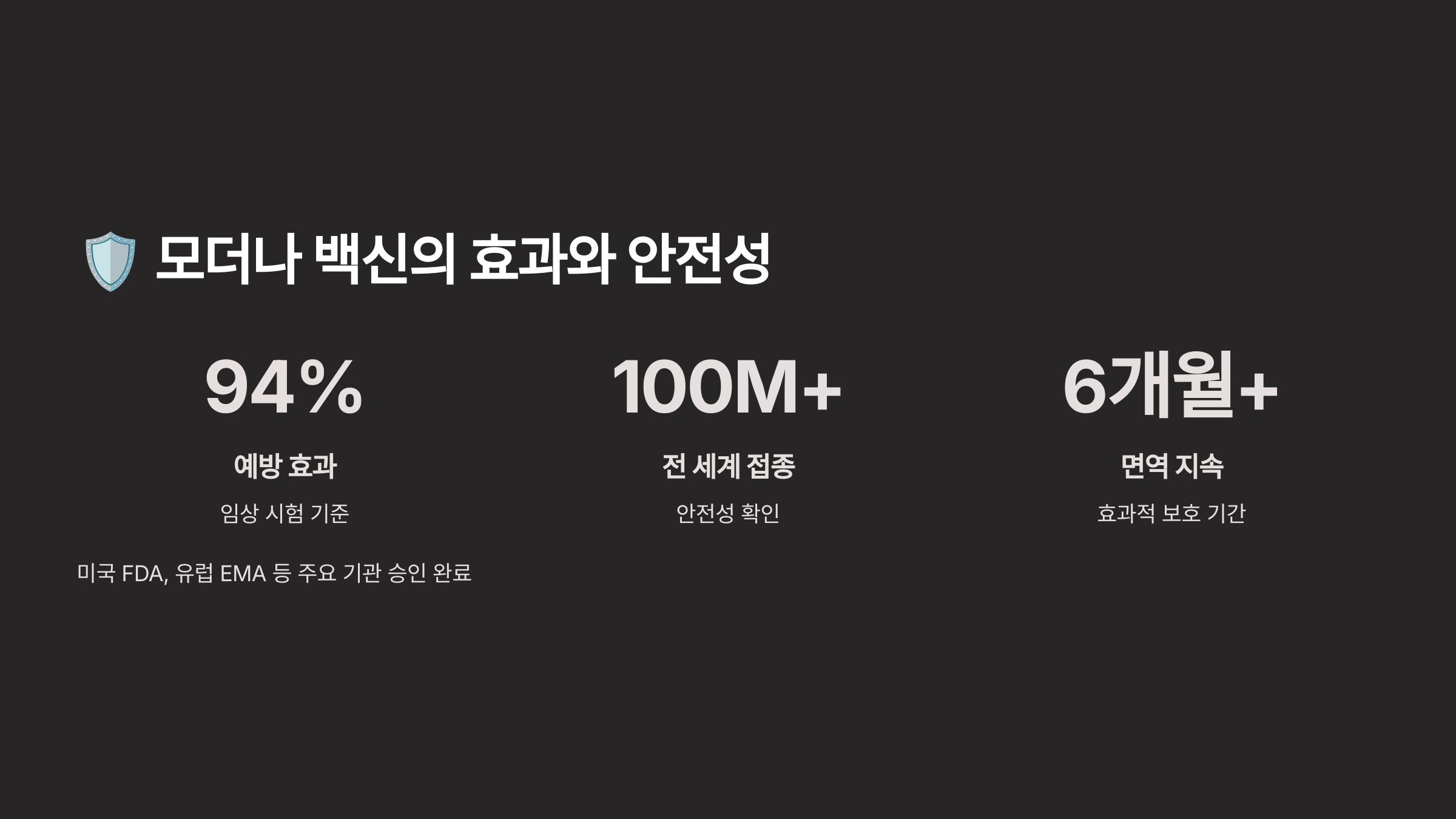 | 2020년 12월 | FDA 긴급사용승인 | 94.1% 예방효과 확인 |