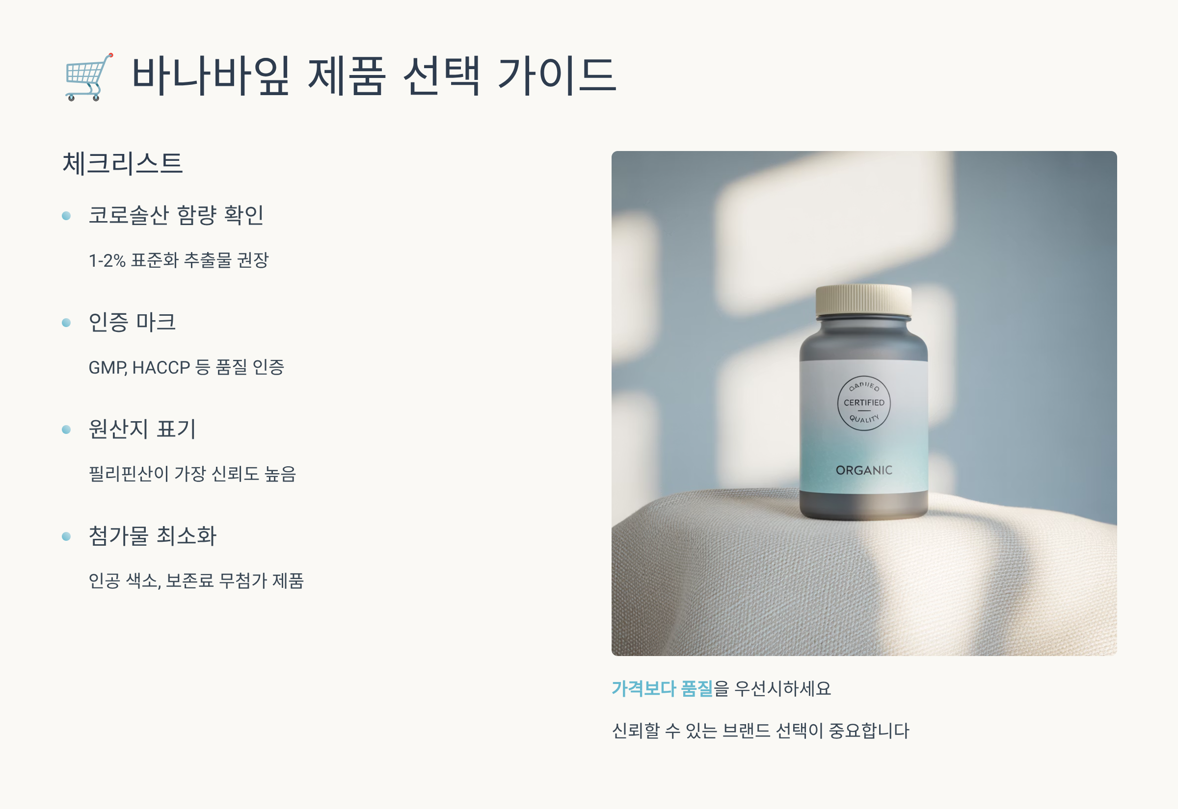 바나바잎 제품을 선택할 때는 품질도 중요해요. GMP 인증을 받은 제조사의 제품을 선택하고, 코로솔산 함량이 명확히 표시된 제품을 고르세요. 유기농 인증을 받은 제품이라면 더욱 안심할 수 있어요. 가격이 너무 싼 제품은 품질이 떨어질 수 있으니 주의해야 해요. 믿을 만한 브랜드의 제품을 선택하는 것이 안전하고 효과적이랍니다! ☕