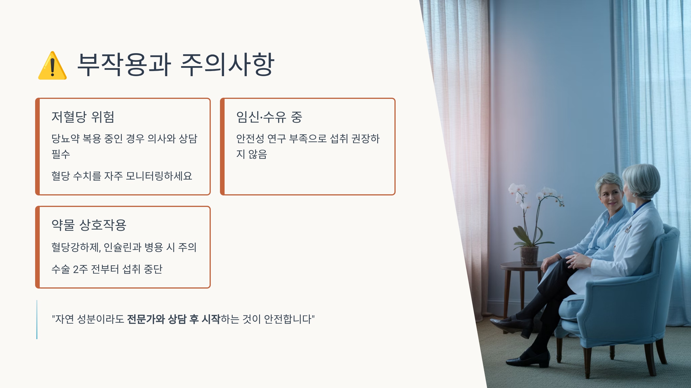 | 당뇨병약 (메트포르민 등) | 혈당 강하 효과 증폭 | 저혈당 위험, 용량 조절 필요 |
