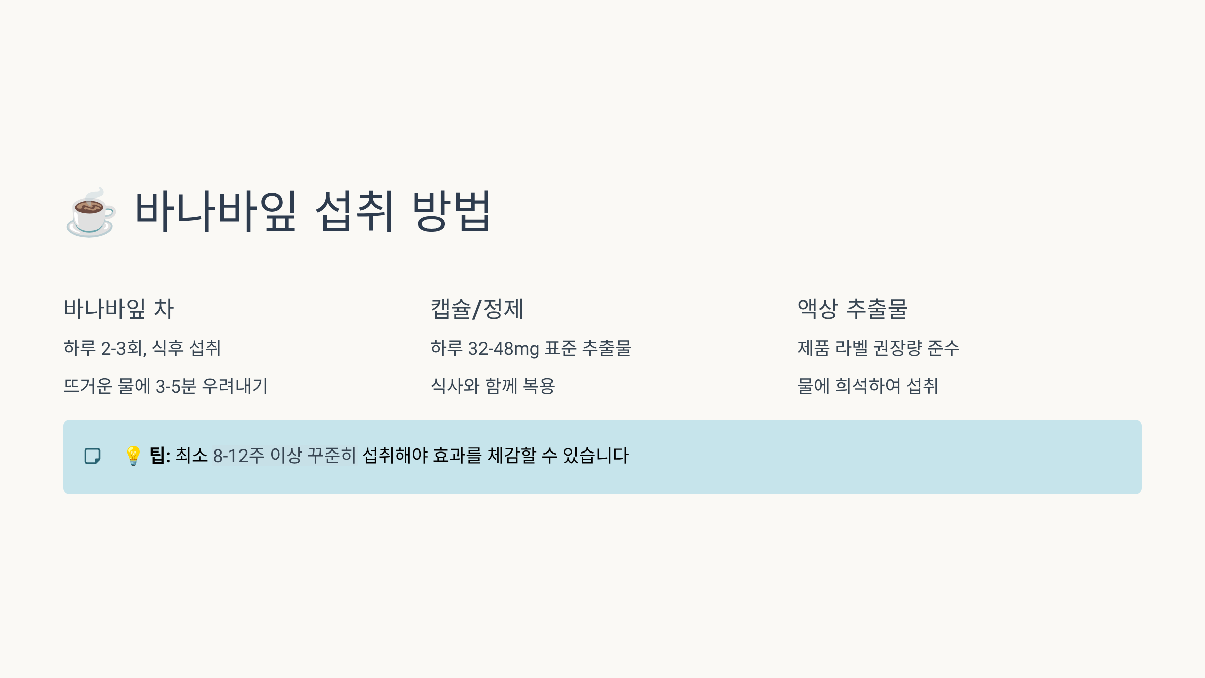 바나바잎을 섭취하는 방법은 다양해요. 가장 전통적인 방법은 바나바잎차로 마시는 거예요. 건조된 바나바잎 3~5g을 뜨거운 물 200ml에 5~10분간 우려내어 하루 2~3회 마시면 돼요. 차로 마실 때는 식사 30분 전에 마시는 것이 혈당 조절에 가장 효과적이랍니다. 바나바잎차는 약간 떫은맛이 나지만, 꿀이나 스테비아를 조금 넣으면 맛있게 즐길 수 있어요.