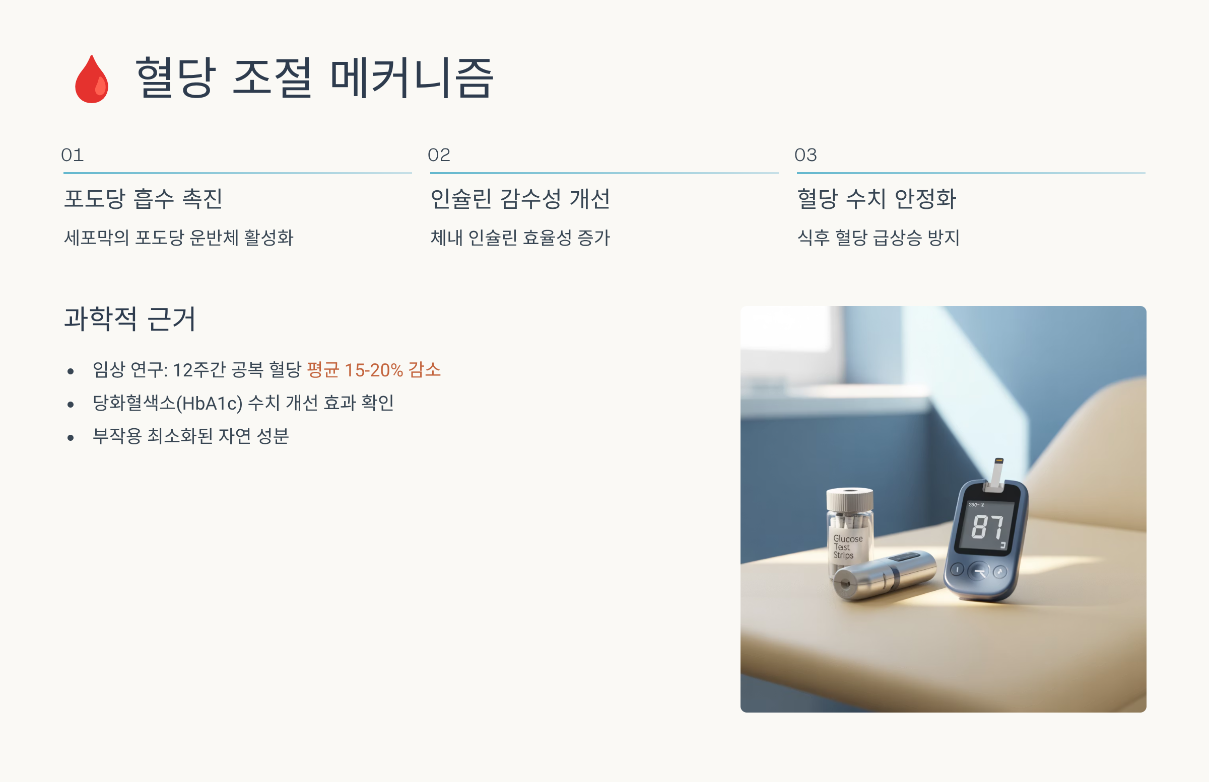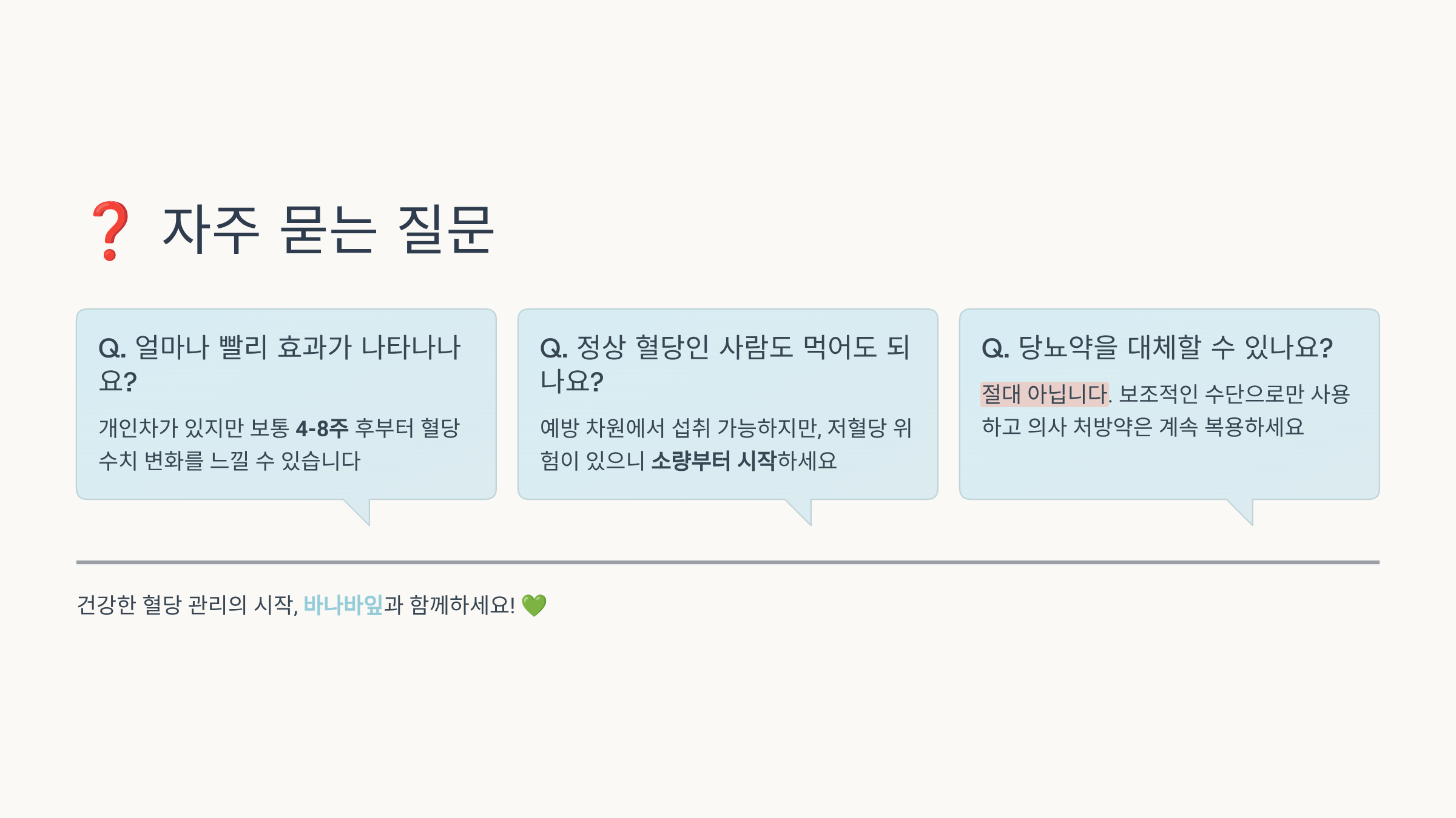 A3. 개인차가 있지만 일반적으로 2~4주 후부터 효과가 나타나기 시작해요. 안정적인 혈당 조절 효과를 보려면 최소 8~12주는 꾸준히 섭취하는 것이 좋아요. 3개월 복용 후 효과를 평가해 보고 지속 여부를 결정하세요.