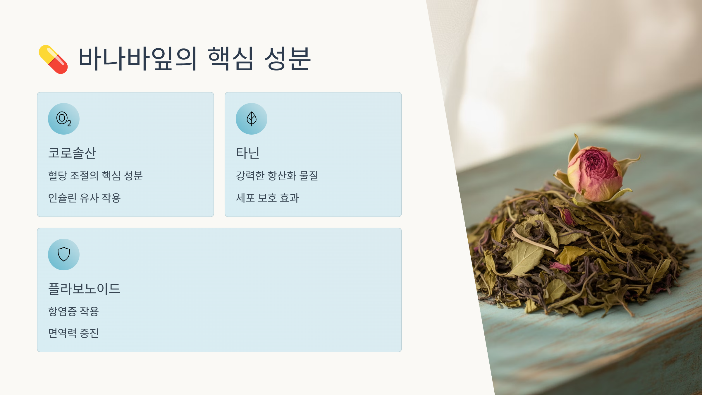 바나바잎에는 다양한 생리활성 성분들이 함유되어 있어요. 가장 중요한 성분은 코로솔산(Corosolic acid)으로, 바나바잎 건조 중량의 약 1~2%를 차지한답니다. 코로솔산은 트리테르페노이드 계열의 화합물로, 인슐린과 유사한 작용을 하여 '식물성 인슐린'이라고도 불려요. 이 성분은 세포의 포도당 흡수를 촉진하고 간에서 포도당 생성을 억제하는 효과가 있어요.