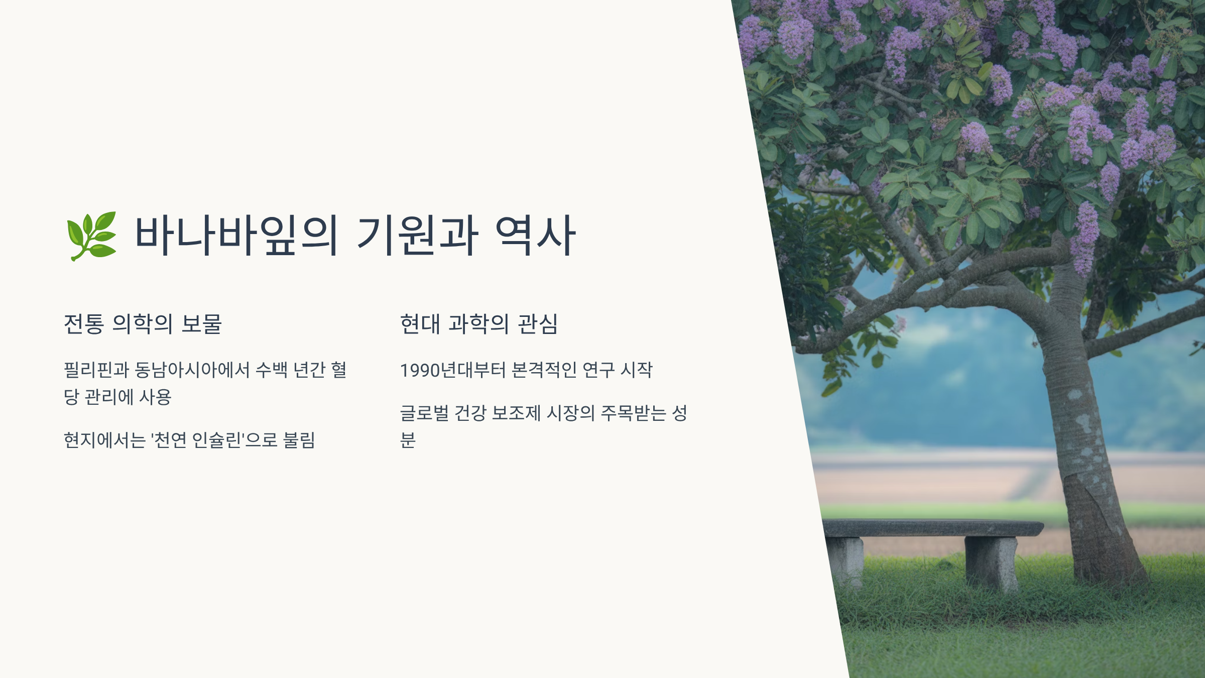 바나바잎은 수천 년 동안 필리핀 전통 의학에서 사용되어 왔어요. 현지인들은 이 잎을 '신의 선물'이라고 부르며 소중히 여겼답니다. 현대 과학이 발달하면서 바나바잎의 효능이 과학적으로 입증되기 시작했고, 이제는 혈당 관리를 위한 천연 설루션으로 각광받고 있어요.