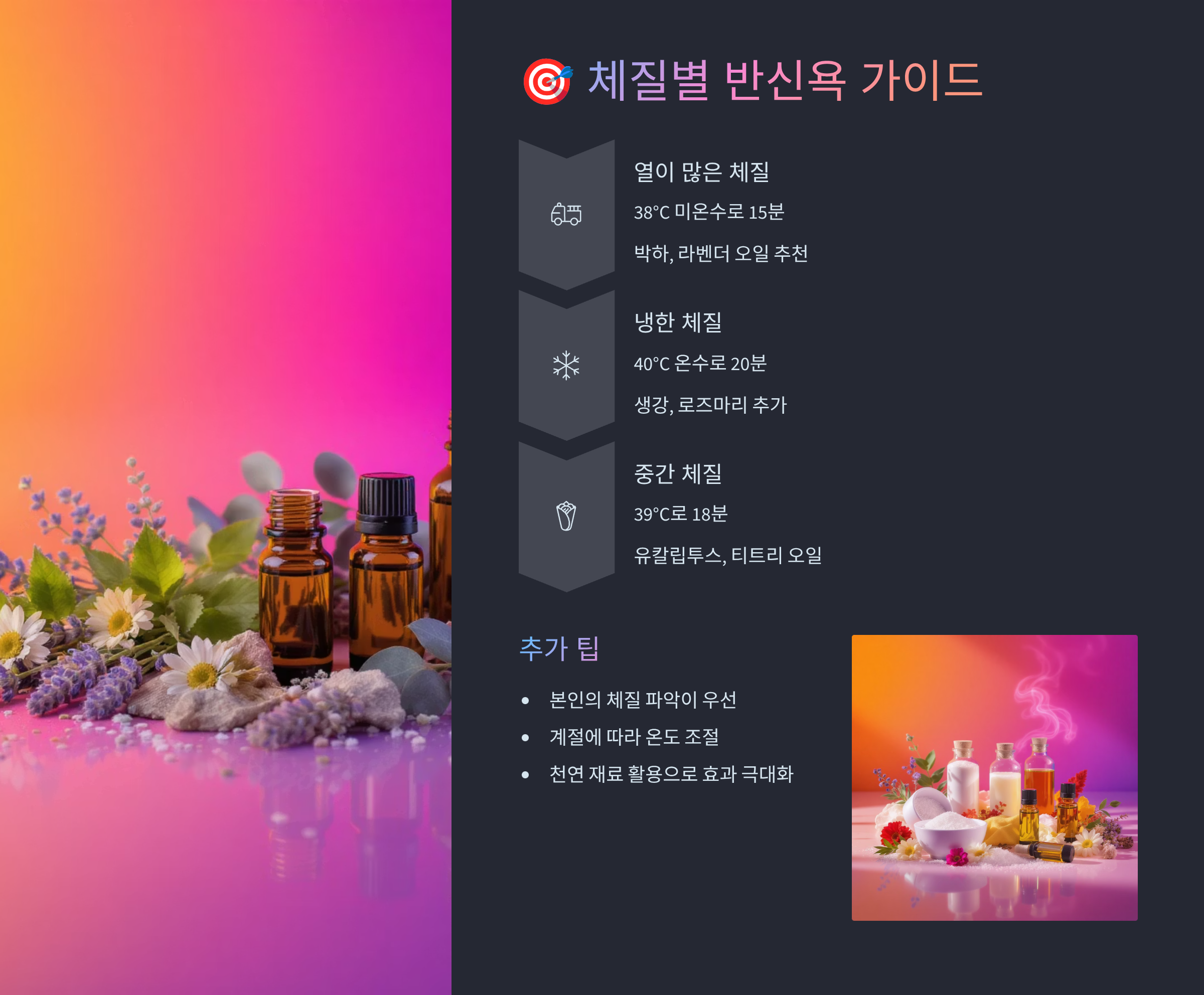 체질별 반신욕은 단순히 온도와 시간만 조절하는 것이 아니에요. 체질에 맞는 차를 마시고, 적절한 입욕제를 사용하며, 음악이나 향기 등 오감을 활용하면 효과가 배가 된답니다. 자신의 체질을 정확히 파악하고 그에 맞는 반신욕법을 찾아가는 과정이 건강 관리의 시작이에요! 🌿