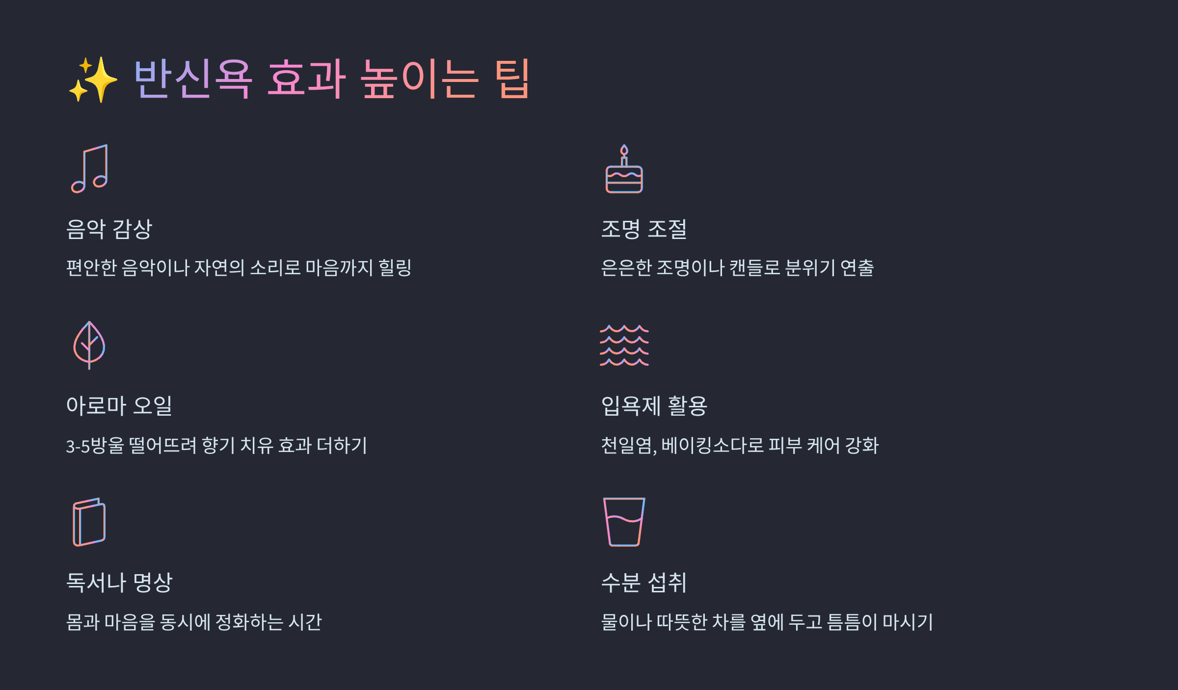 음악과 조명도 반신욕의 중요한 요소예요. 클래식 음악이나 자연의 소리는 뇌파를 안정시켜 더 깊은 이완 상태로 이끌어요. 528Hz 주파수 음악은 DNA 복구와 스트레스 해소에 도움이 된다고 알려져 있어요. 조명은 은은한 간접 조명이나 캔들을 활용하면 멜라토닌 분비를 방해하지 않아 수면의 질이 향상돼요.