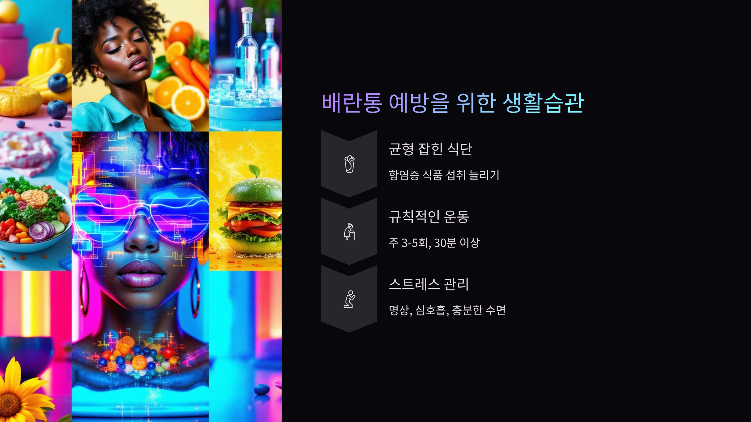 균형 잡힌 식단은 배란통 예방의 기본이에요. 항염증 식품을 충분히 섭취하면 배란통을 예방할 수 있어요. 베리류, 녹색 잎채소, 토마토, 올리브오일 등이 대표적인 항염증 식품이에요. 통곡물, 콩류, 견과류는 혈당을 안정시켜 호르몬 균형을 유지하는 데 도움이 돼요. 하루 5회 이상 과일과 채소를 섭취하고, 가공식품과 설탕 섭취를 줄이는 것이 중요해요. 식사 시간을 규칙적으로 유지하면 신체 리듬이 안정돼요.