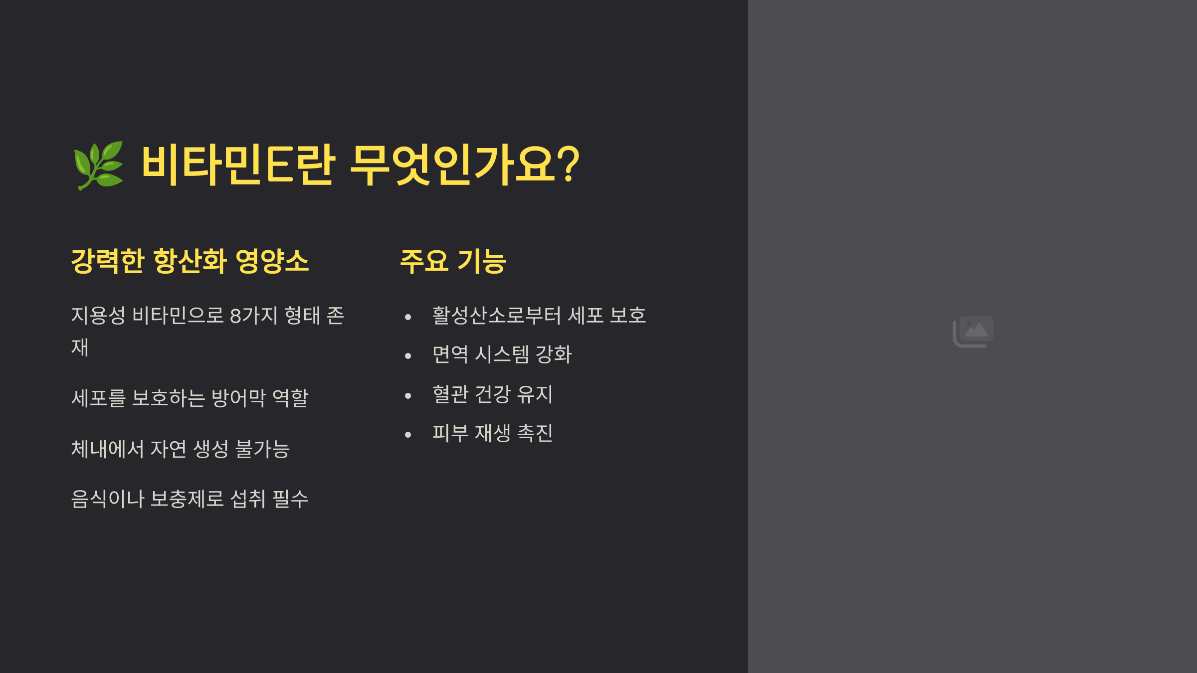 비타민E는 우리 몸에서 강력한 항산화 작용을 하는 필수 영양소예요. 세포막을 보호하고 피부 건강을 유지하는 데 핵심적인 역할을 담당하고 있답니다. 특히 활성산소로부터 세포를 지켜주는 방패 역할을 하기 때문에 노화 방지와 면역력 강화에 꼭 필요한 영양소로 알려져 있어요.