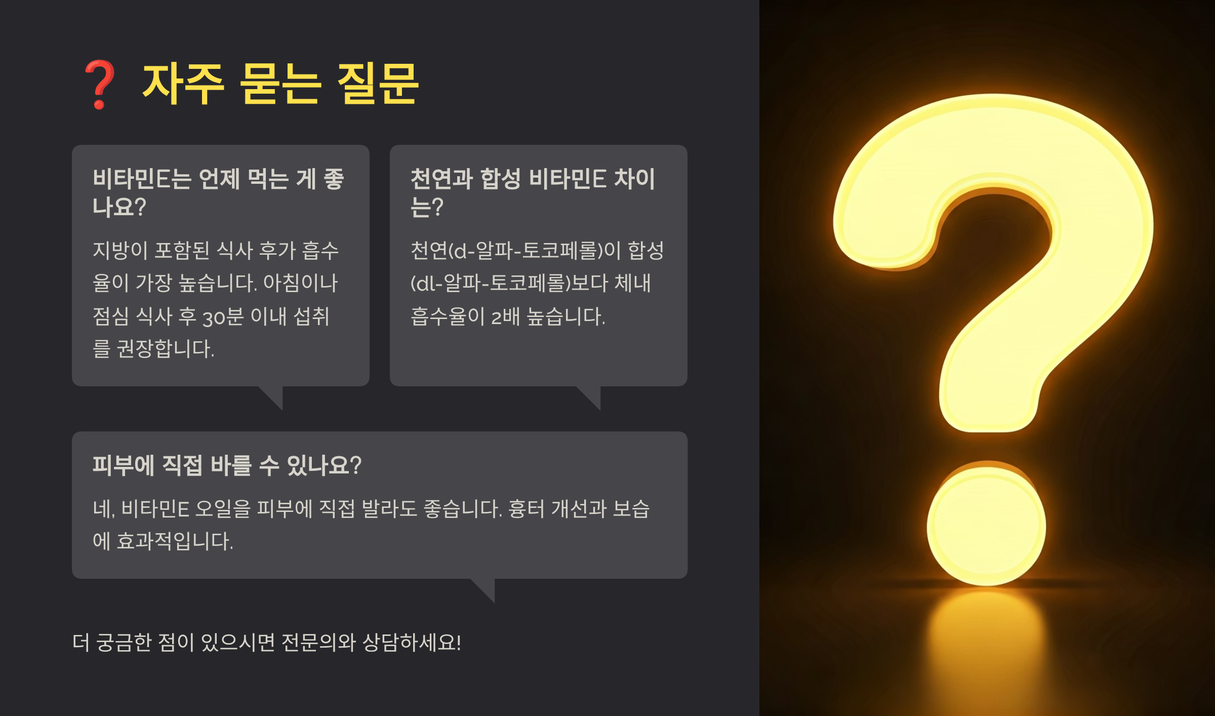 건강한 성인이라면 식품을 통해 비타민E를 섭취하는 것이 가장 안전하고 효과적이에요. 보충제가 필요한 경우에도 일일 권장량 수준의 저용량 제품을 선택하고, 고용량 제품은 의사의 처방이 있는 경우에만 복용하는 것이 바람직해요.