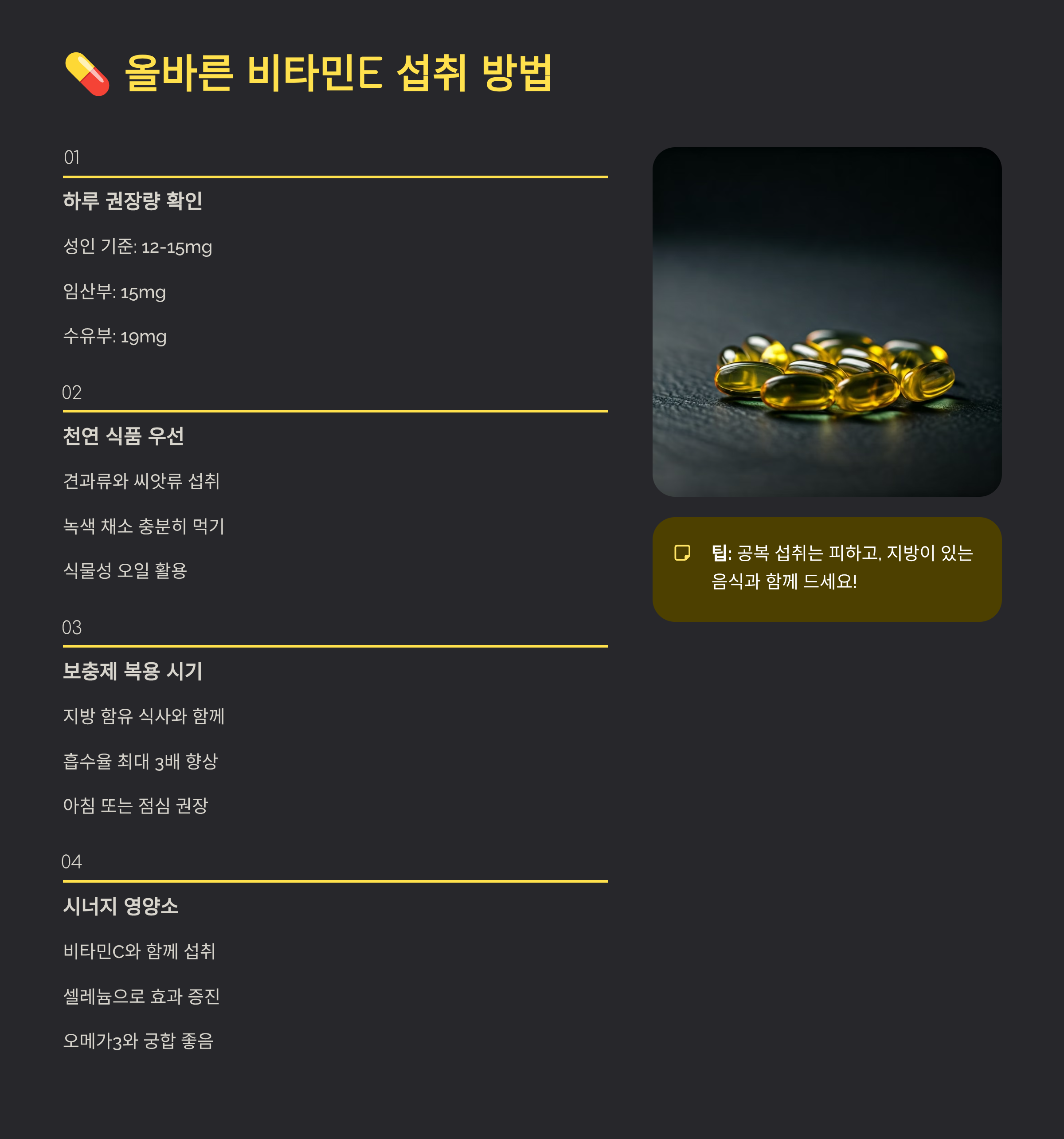 비타민E는 지용성이기 때문에 지방과 함께 섭취해야 흡수가 잘 돼요. 그래서 견과류나 식물성 기름에 풍부하게 들어 있는 거랍니다. 음식을 통해 섭취할 때는 건강한 지방과 함께 먹는 것이 좋고, 보충제로 섭취할 때도 식사와 함께 복용하는 것이 효과적이에요.