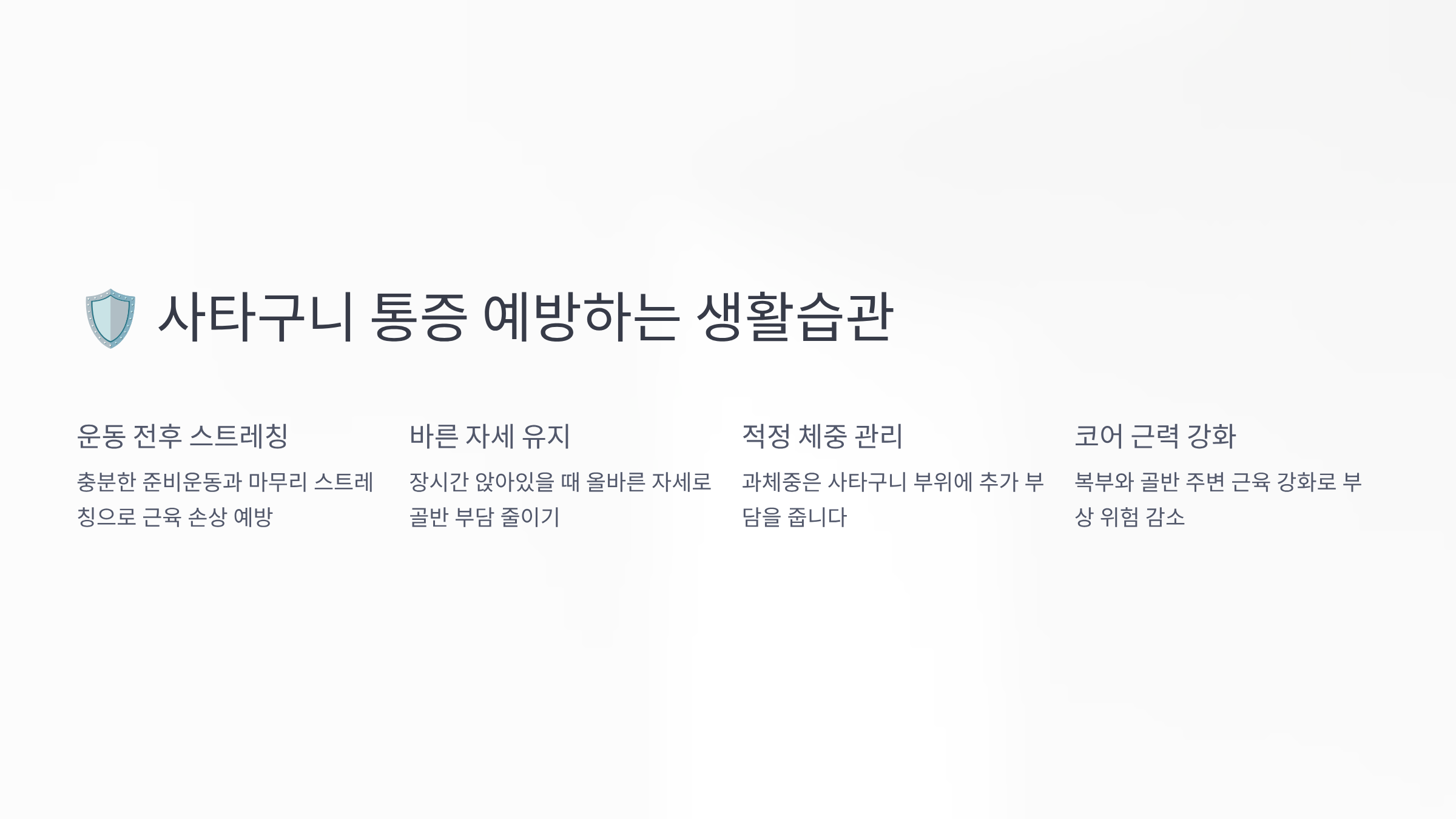 사타구니 통증을 예방하기 위해서는 평소 생활습관이 매우 중요해요. 첫 번째로 운동 전 충분한 준비운동이 필수예요. 특히 내전근과 고관절 주변 근육을 스트레칭해 주면 부상 위험을 크게 줄일 수 있답니다. 준비운동 없이 갑자기 격렬한 운동을 시작하면 근육이 준비가 안 된 상태에서 강한 힘이 가해져서 손상이 발생하기 쉬워요. 최소 10-15분은 가벼운 유산소와 스트레칭으로 몸을 풀어주세요.