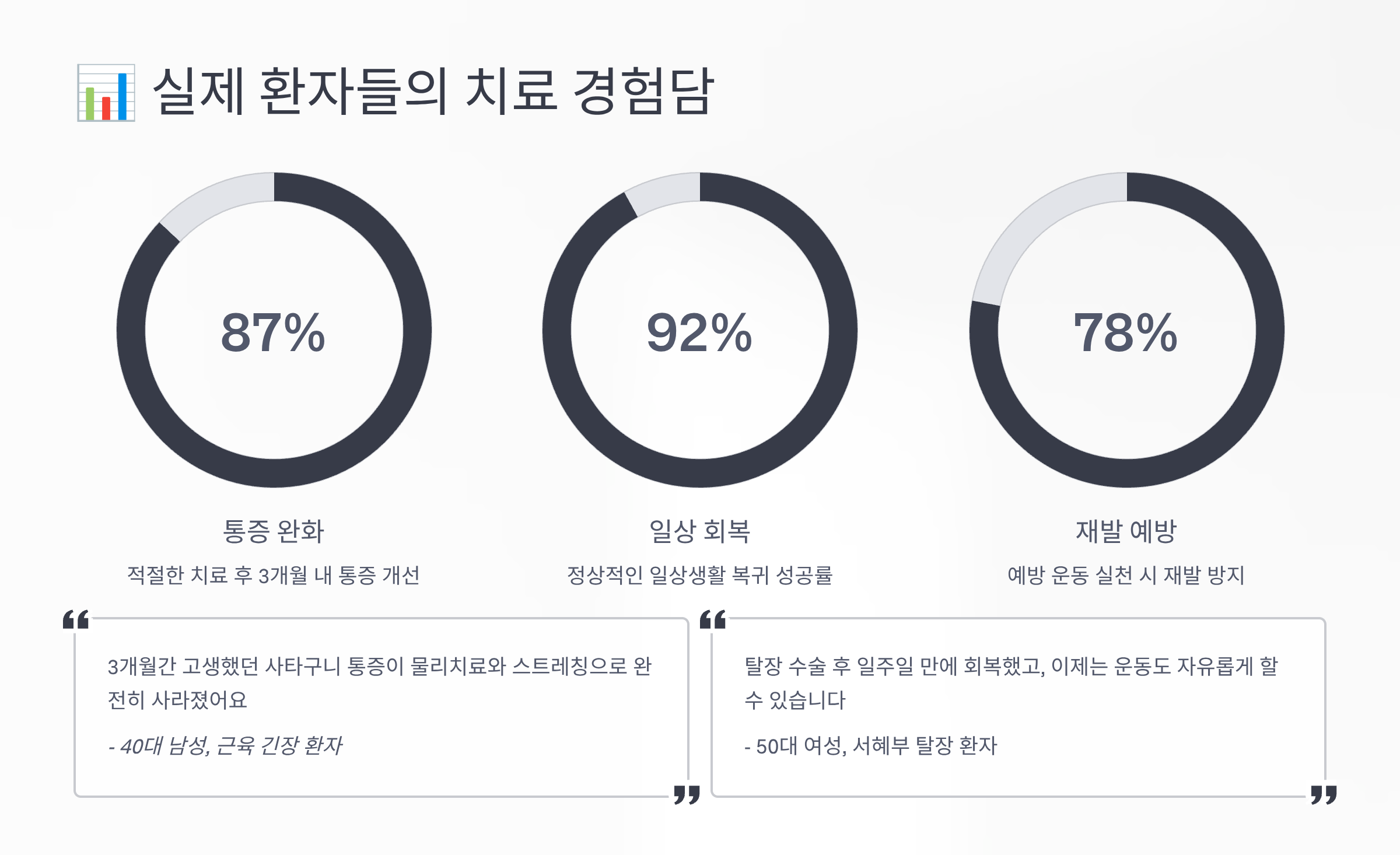 실제로 사타구니 통증을 경험하고 치료를 받은 분들의 이야기를 들어보면 많은 분들이 공통적으로 "진작 병원에 갈 걸"이라고 후회하셨어요. 40대 직장인 김 모 씨는 축구를 하다가 사타구니에 통증이 생겼는데, 단순 근육통이려니 하고 3개월을 방치했다가 결국 MRI 검사에서 고관절 순 파열 진단을 받았어요. 조기에 발견했다면 물리치료만으로 나을 수 있었는데, 늦어지는 바람에 관절경 수술이 필요했답니다.