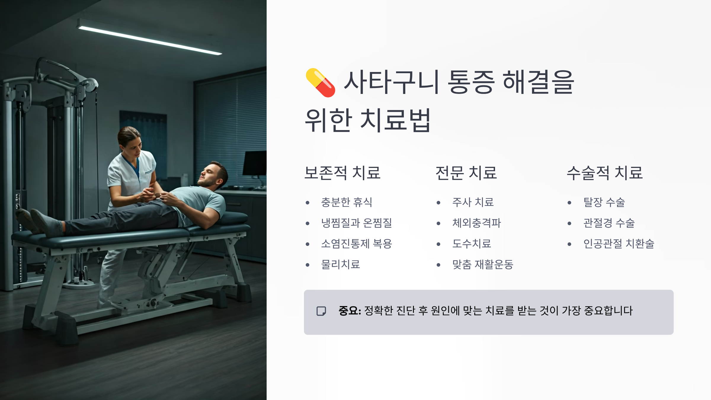 | 물리치료 | 만성 통증, 관절 문제 | 4-8주 | 근본적 치료, 재발 예방 |