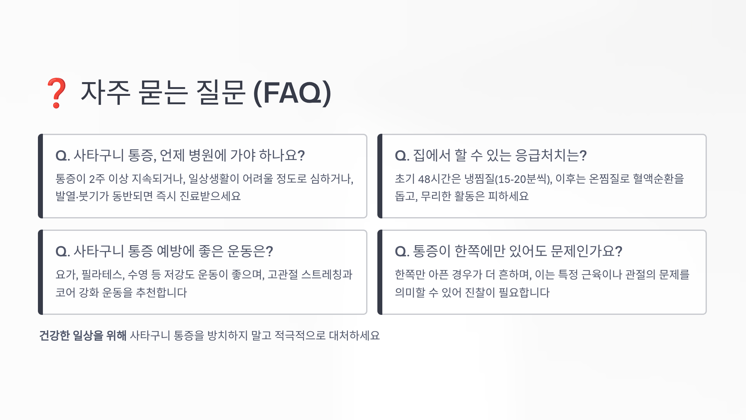 면책조항: 본 콘텐츠는 건강 정보 제공을 목적으로 작성되었으며, 의학적 진단이나 치료를 대체할 수 없습니다. 사타구니 통증이 있으신 경우 반드시 전문 의료진의 진찰을 받으시기 바랍니다. 개인의 건강 상태에 따라 적합한 치료법이 다를 수 있으므로, 본 콘텐츠의 내용을 참고용으로만 활용해 주시고 중요한 건강 결정은 의사와 상담 후 진행하시기 바랍니다. 응급 상황이 의심되면 즉시 119에 연락하거나 가까운 응급실을 방문하세요.