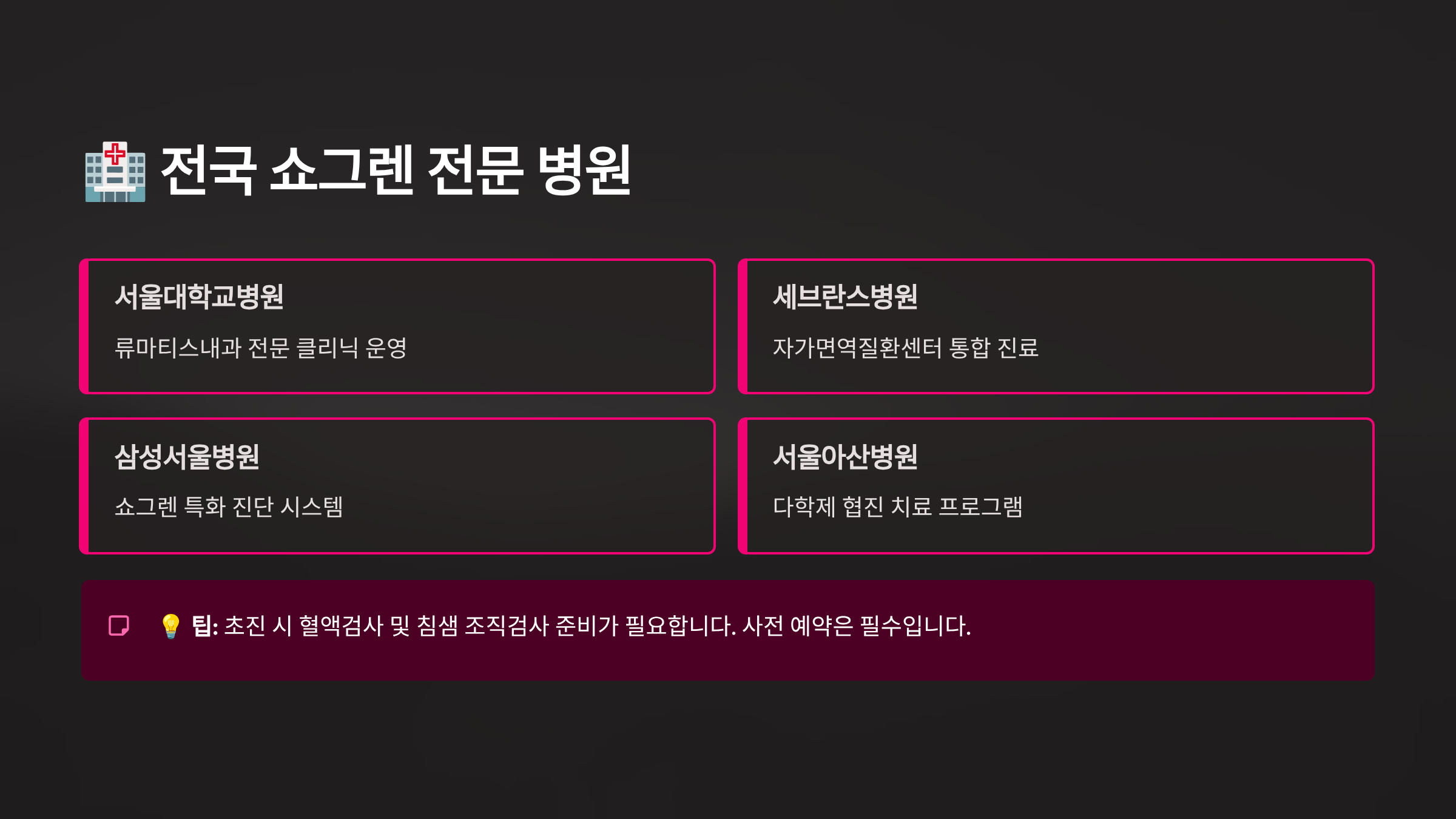 쇼그렌증후군은 류머티즘내과 전문의의 진료가 필요해요. 서울에는 서울대병원, 삼성서울병원, 서울아산병원, 세브란스병원 등 대형병원의 류머티즘내과가 유명해요. 특히 서울대병원 류머티즘내과는 쇼그렌 특화 클리닉을 운영하며, 다학제 진료로 안과, 치과와 협진이 가능해요.
