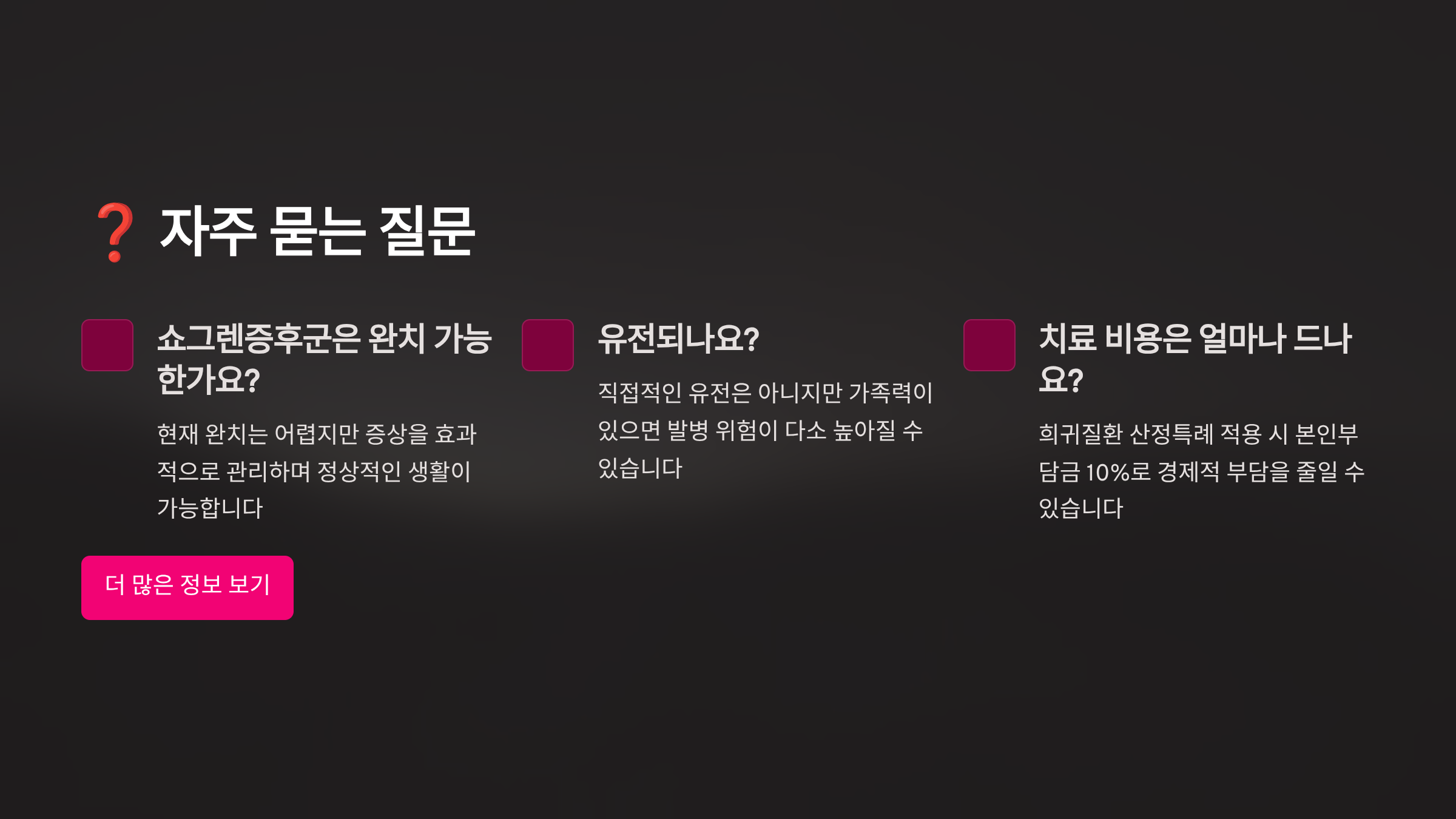 쇼그렌증후군은 평생 관리가 필요한 질환이지만, 적절한 치료와 생활관리로 충분히 일상생활을 영위할 수 있습니다. 무엇보다 조기 발견과 꾸준한 관리가 중요하니, 의심 증상이 있다면 지체 없이 전문의 진료를 받으시길 바랍니다. 여러분의 건강한 삶을 응원합니다! 😊