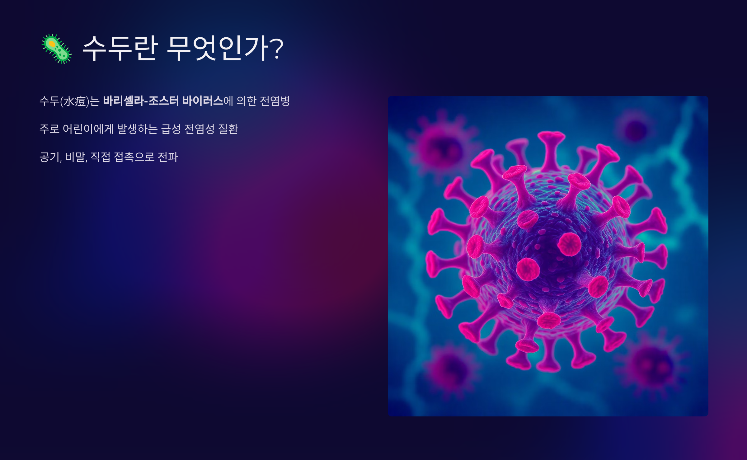 수두는 수두-대상포진 바이러스(Varicella-Zoster Virus, VZV)가 원인이 되어 발생하는 전염성 질환이에요. 이 바이러스는 헤르페스 바이러스과에 속하며, 처음 감염되면 수두를 일으키고 나중에 재활성화되면 대상포진을 일으킬 수 있답니다. 수두는 주로 2~8세 어린이에게 많이 발생하지만, 예방접종을 받지 않은 사람이라면 누구나 걸릴 수 있어요. 전 세계적으로 매년 수백만 명이 수두에 감염되고 있으며, 예방접종이 도입되기 전에는 거의 모든 사람이 어린 시절에 수두를 경험했답니다.