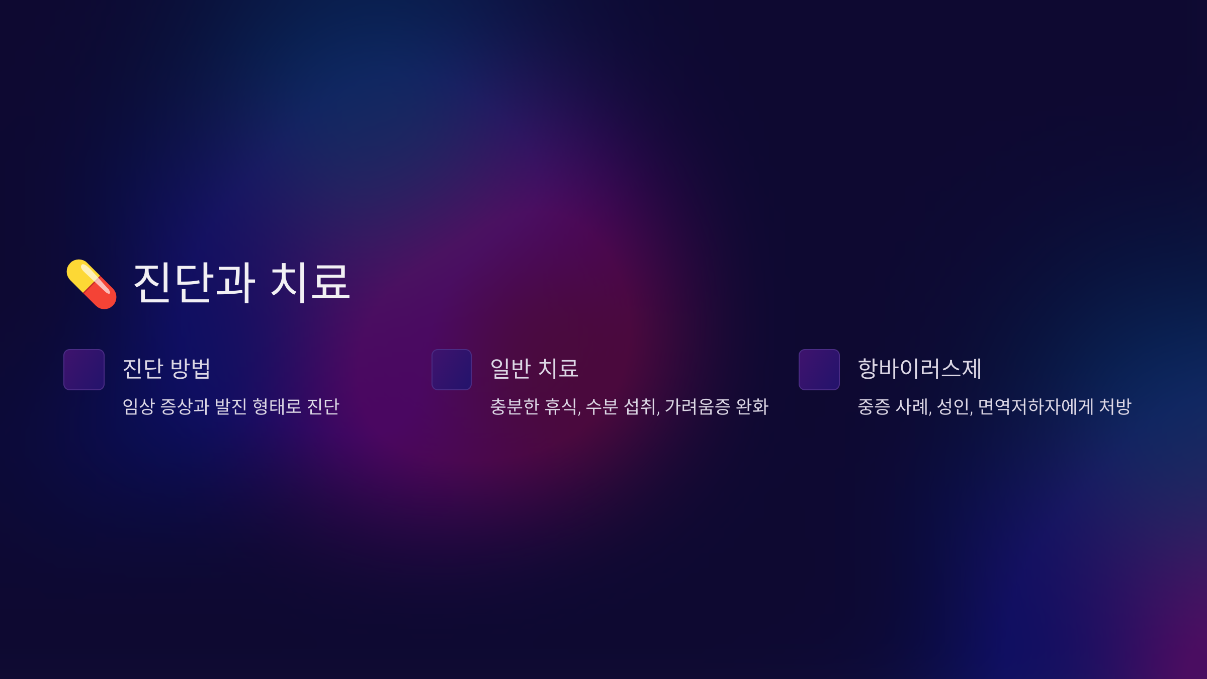 항바이러스제 치료는 특정 상황에서만 필요해요. 12세 이상의 청소년과 성인, 만성 피부질환이나 폐질환이 있는 환자, 아스피린을 장기 복용하는 환자, 면역저하 환자 등은 항바이러스제 치료를 고려해야 해요. 아시클로버(acyclovir)가 가장 많이 사용되는 약물이며, 발진이 나타난 후 24~48시간 이내에 시작해야 효과적이랍니다. 보통 5~7일간 복용하며, 중증 환자는 정맥주사로 투여할 수도 있어요.