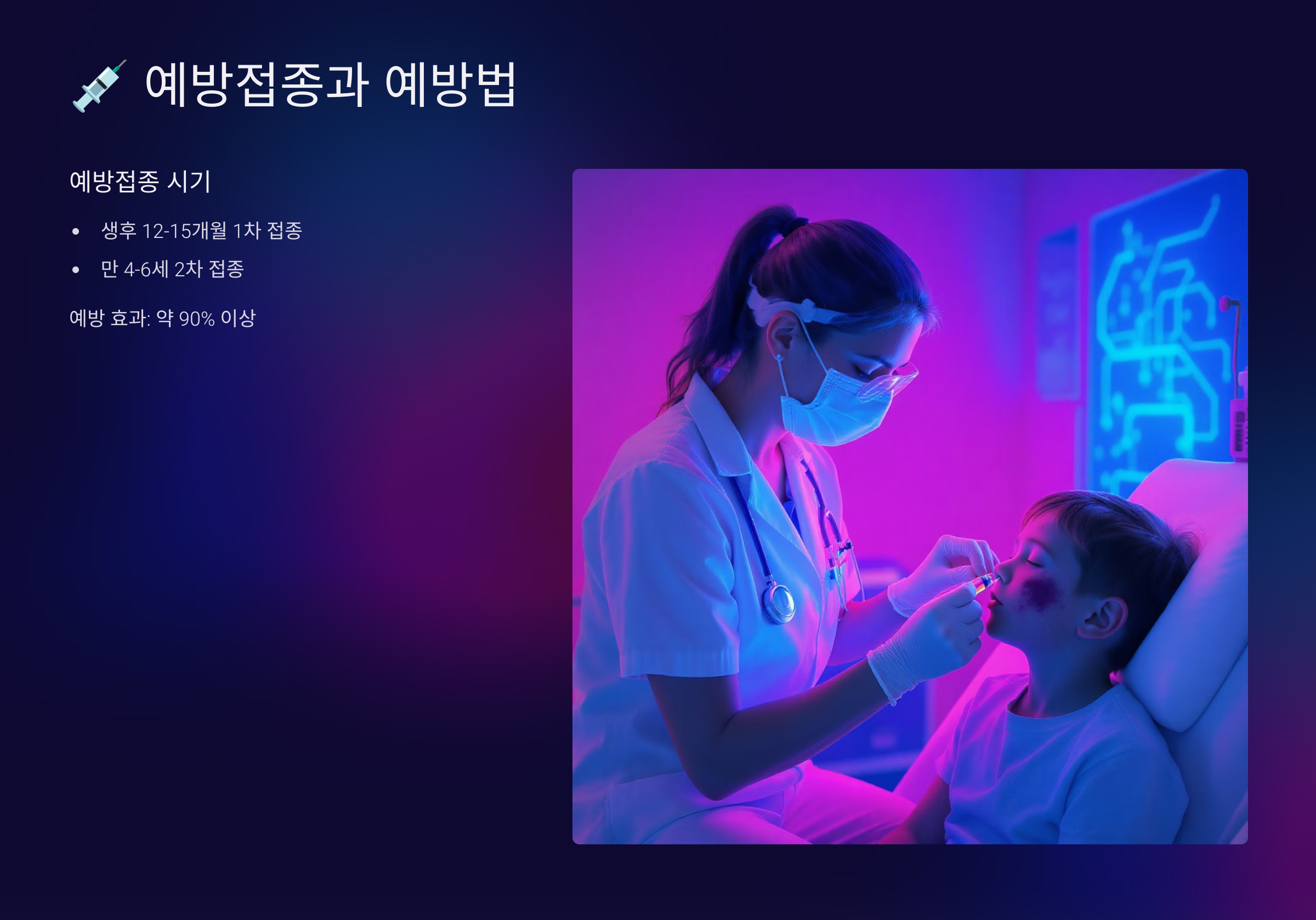 나의 경험으로는 조카가 수두에 걸렸을 때 온 가족이 긴장했던 기억이 있어요. 다행히 다른 가족들은 모두 예방접종을 했거나 어릴 때 수두를 앓았던 터라 감염되지 않았지만, 전염성이 얼마나 강한지 실감할 수 있었답니다. 수두는 한 번 걸리면 평생 면역이 생기지만, 바이러스는 신경절에 잠복해 있다가 나중에 면역력이 떨어지면 대상포진으로 재활성화될 수 있어요. 그래서 수두 예방이 단순히 어린 시절의 문제가 아니라 평생 건강과 관련된 중요한 문제라는 걸 알 수 있답니다.